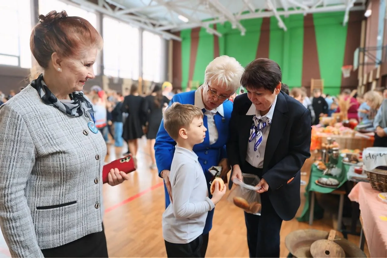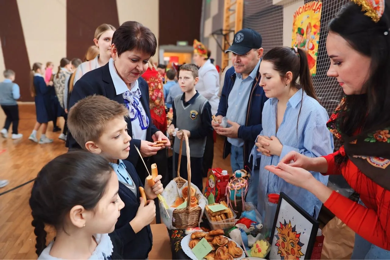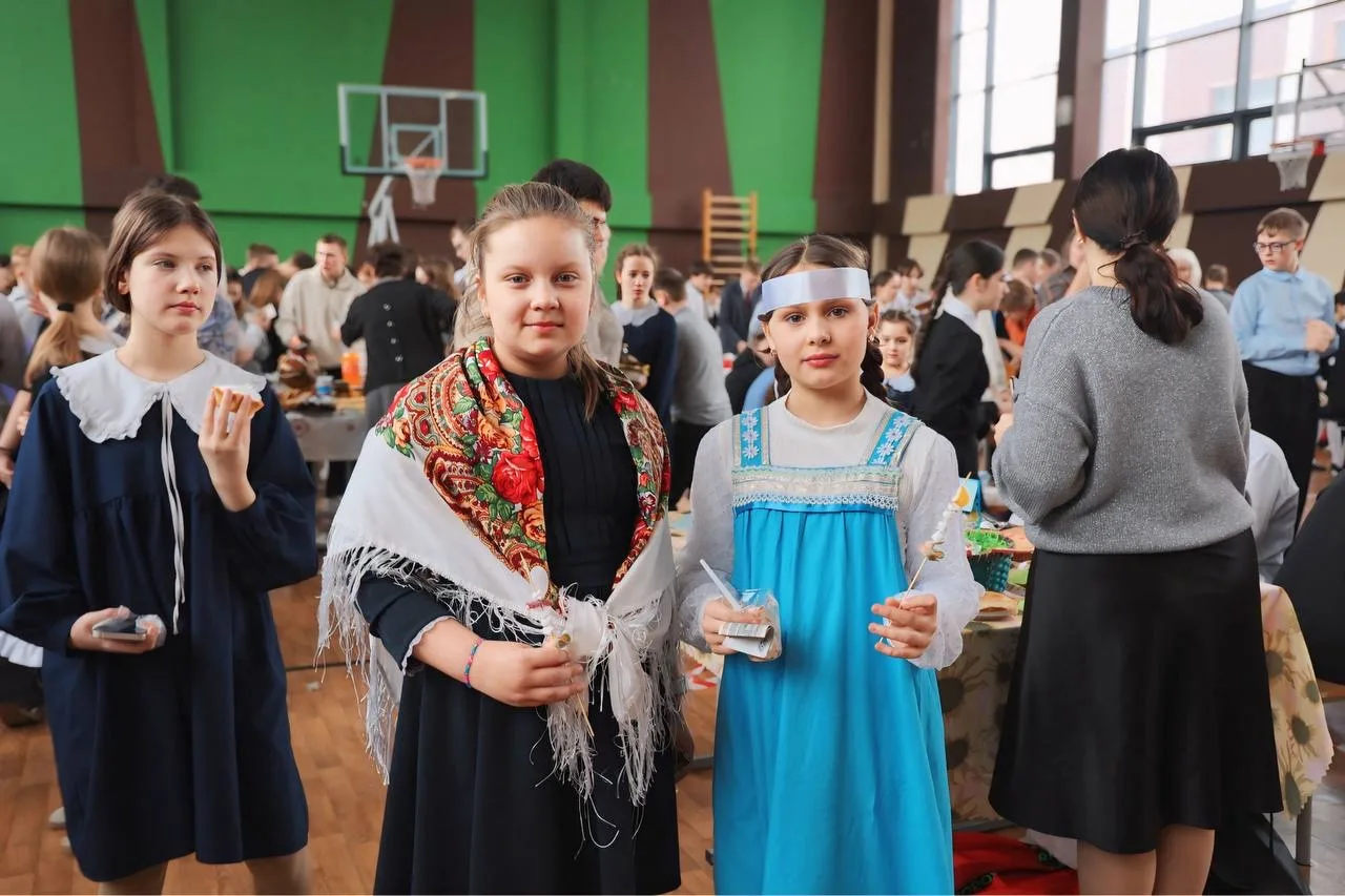 Школьный спортивный зал превратился в оживленную ярмарку, где ароматы свежеиспеченных блинов и румяных пирогов смешивались с задорными частушками скоморохов.