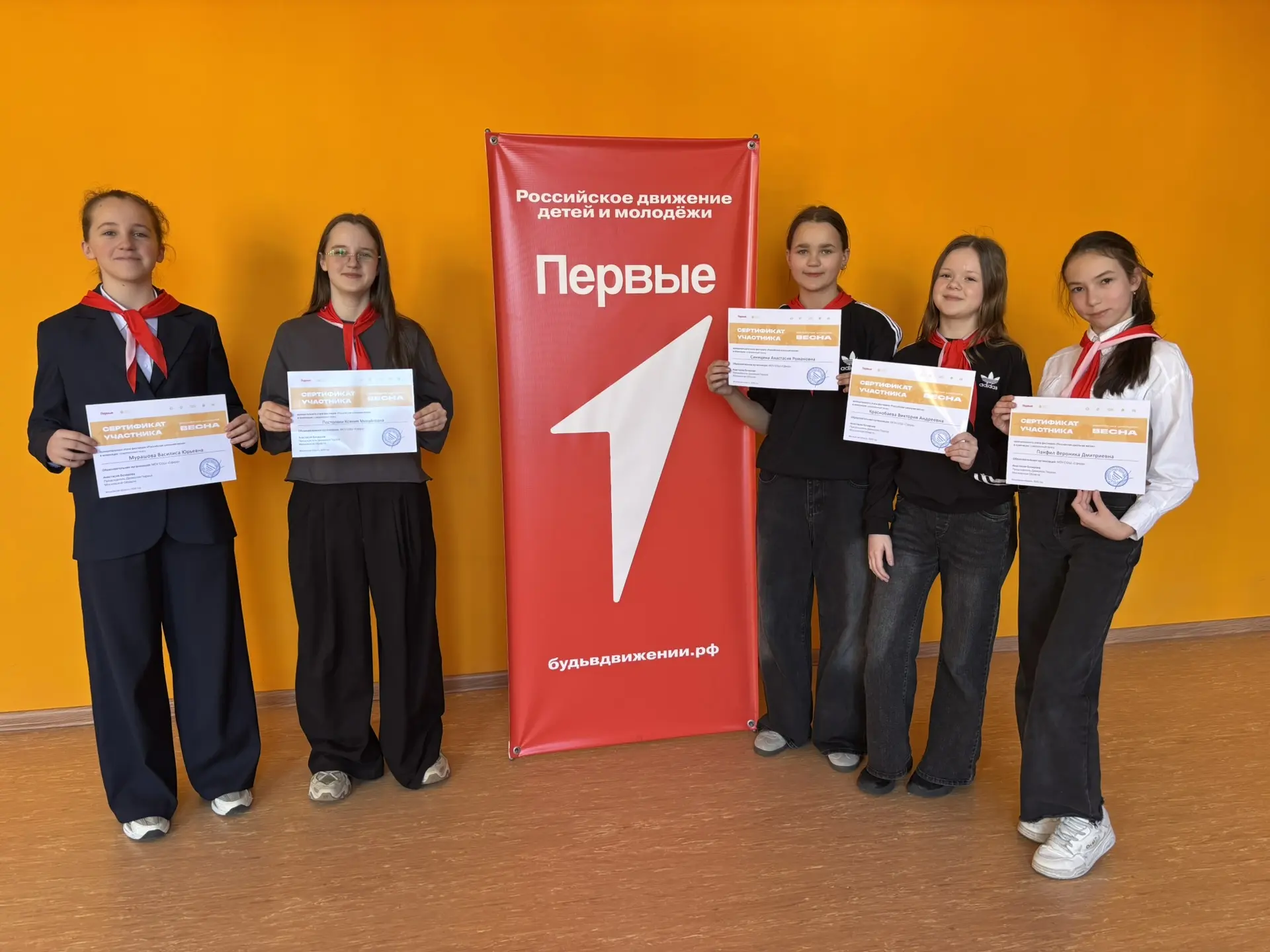 Активистки Движения Первых, ученицы 6 В класса МОУ «СОШ «Сфера» г.о. Воскресенск, с ярким названием своего хореографического коллектива «Танцпол», получили Сертификаты участника в муниципальном этапе Всероссийского фестиваля «Российская школьная весна» в танцевальном направлении, номинация: современный танец.