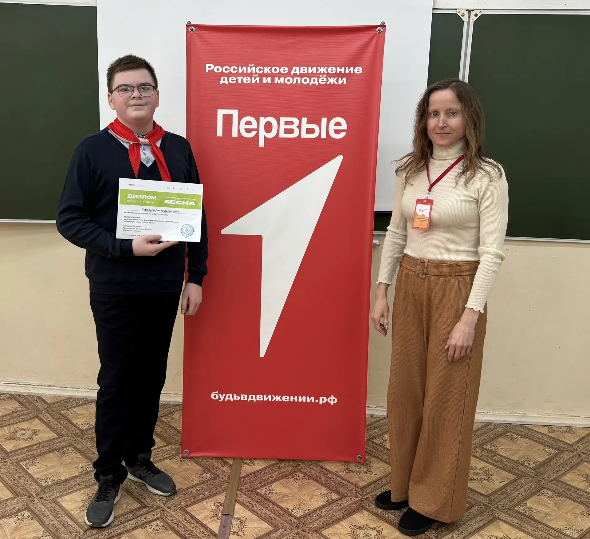 Поздравляем Дениса Воробьёва, учащегося 10 В класса МОУ «СОШ «Сфера» г.о. Воскресенск, активиста Движения Первых, с почетным 3-м местом на муниципальном этапе Всероссийского фестиваля «Российская школьная весна»!!! 🌟🥰👍 Денис удостоен Диплома «Лауреат III степени» в номинации: Малая Родина Первых.