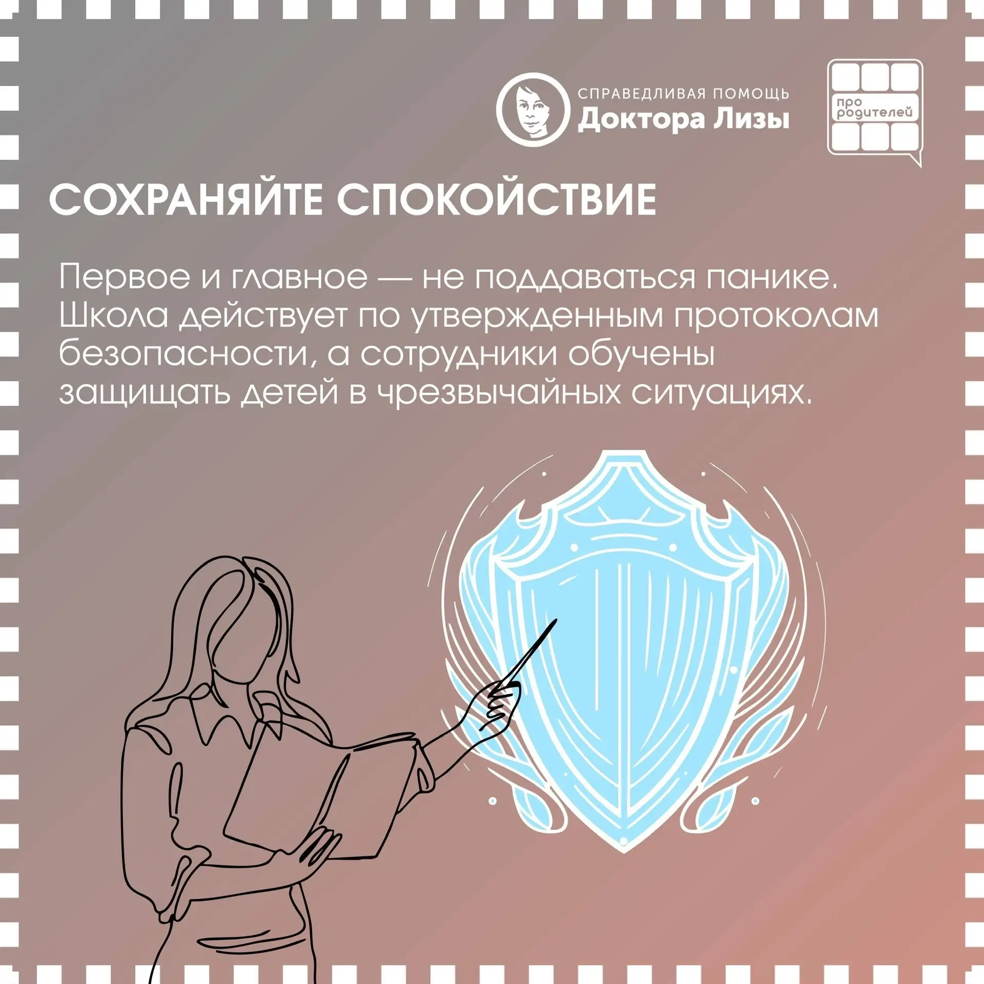 Совместно с Справедливая помощь Доктора Лизы мы подготовили карточки — в них четкий и спокойный алгоритм для родителей: что делать, если во время атаки БПЛА ребенок находится в школе.
