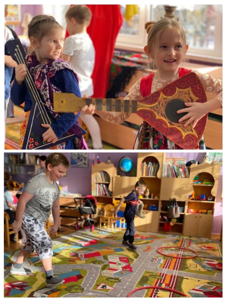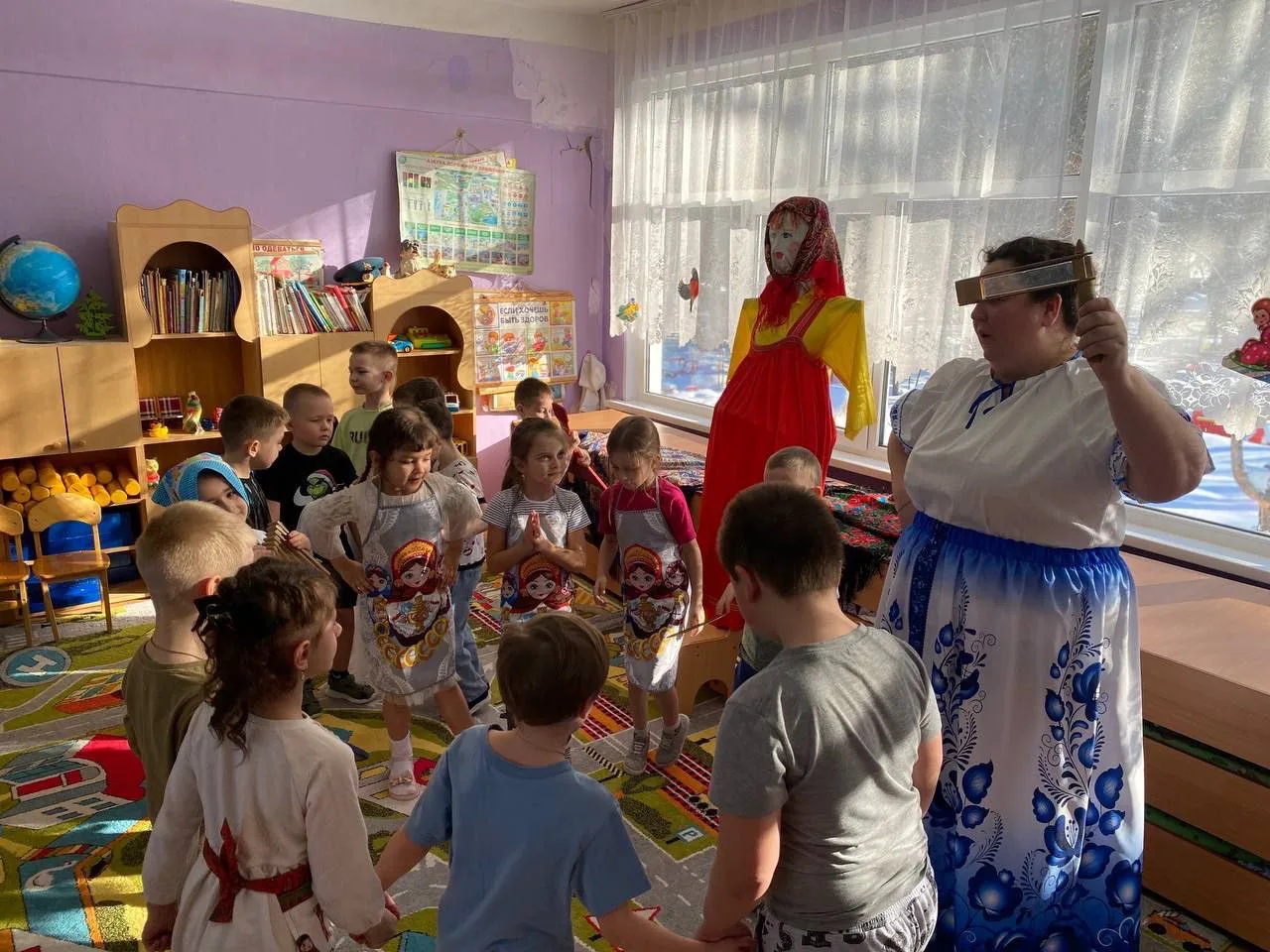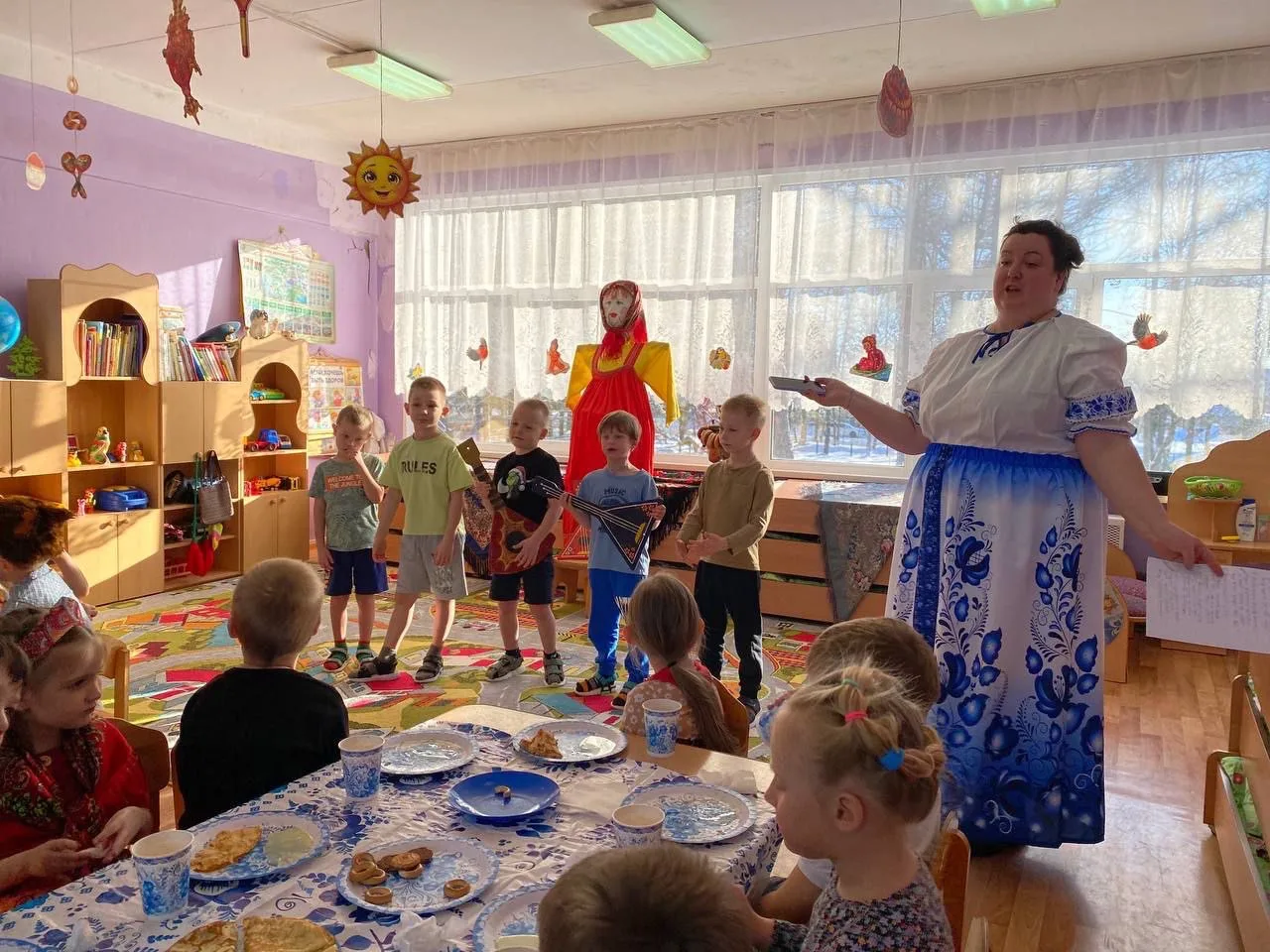 Дети угощались блинами (символ 🌞), которые с любовью приготовили родители, играли в русские народные игры "Передай блин", "Метание валенка", водили хороводы, пели заклички, потешки про весну, танцевали, читали стихи.