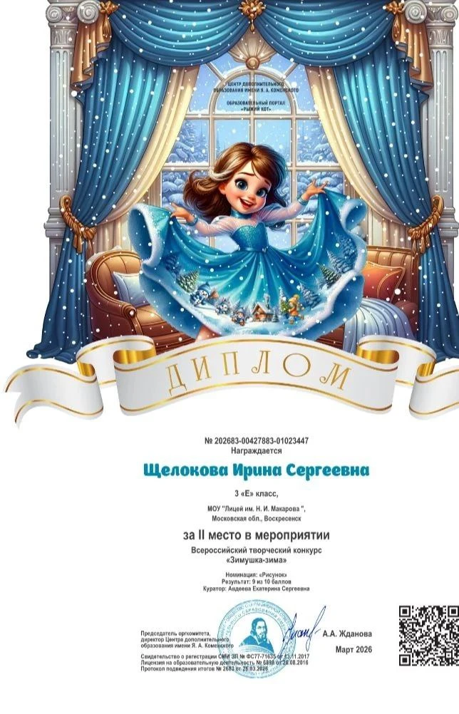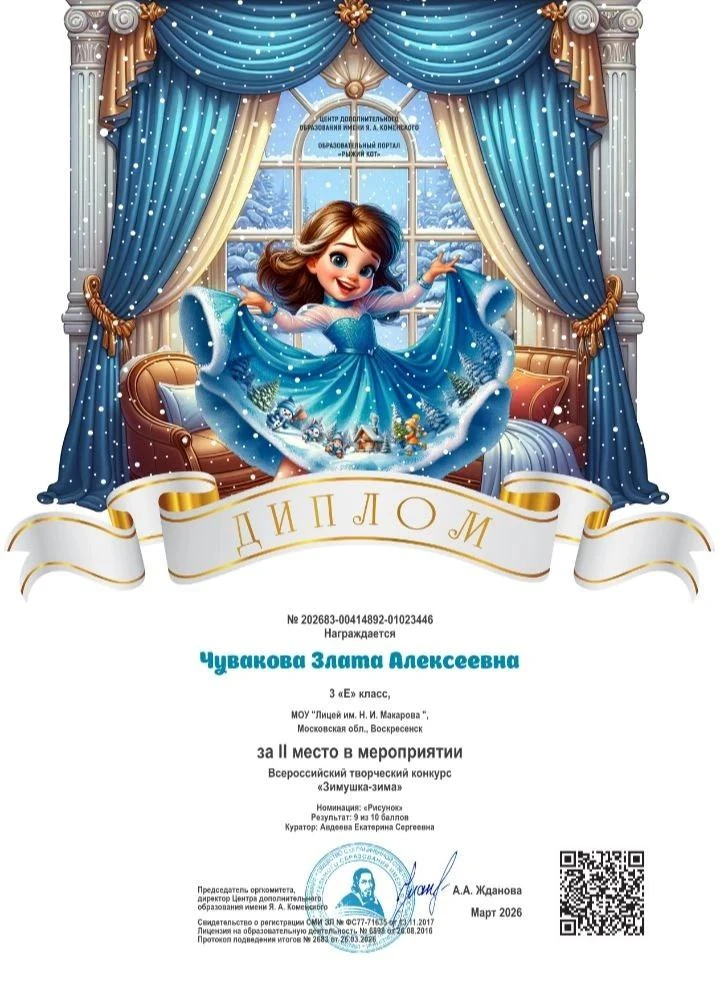 Поздравляем обучающихся 3 "Е" класса лицея Чувакову Злату и Щелокову Ирину, ставших призёрами Всероссийского творческого конкурса рисунков «Зимушка-зима» на портале «Рыжий кот».