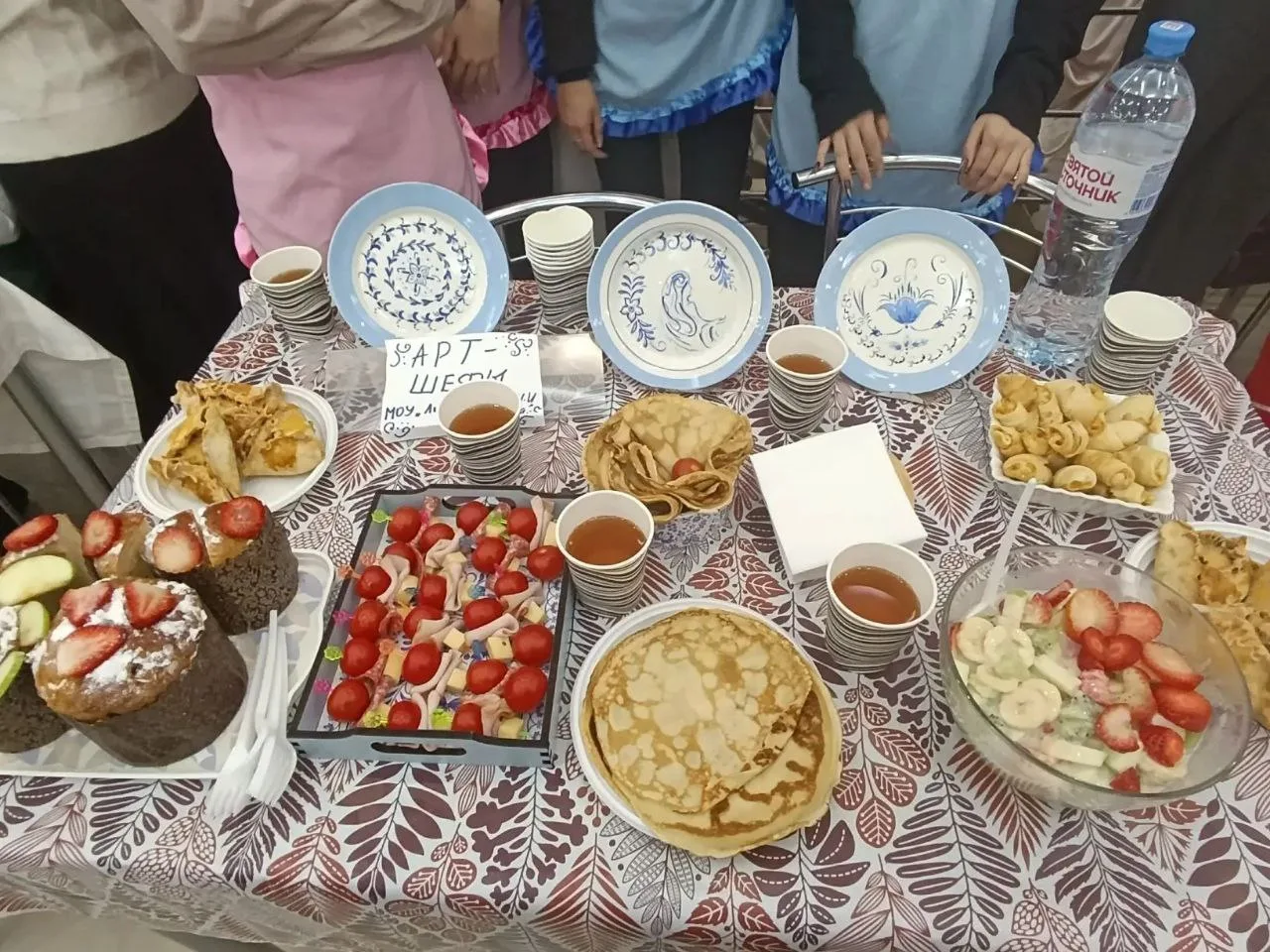 Конкурсная программа состояла из двух ответственных этапов: в начале наши «Арт-шефы» представили на суд жюри праздничный стол, оформленный в лучших народных традициях: золотистые рогалики, ароматные пирожки с мясом, изящные канапе с ветчиной, румяные блины — символ приближающейся весны. Жюри особо отметило не только безупречный вкус блюд, но и творческую фантазию в сервировке.