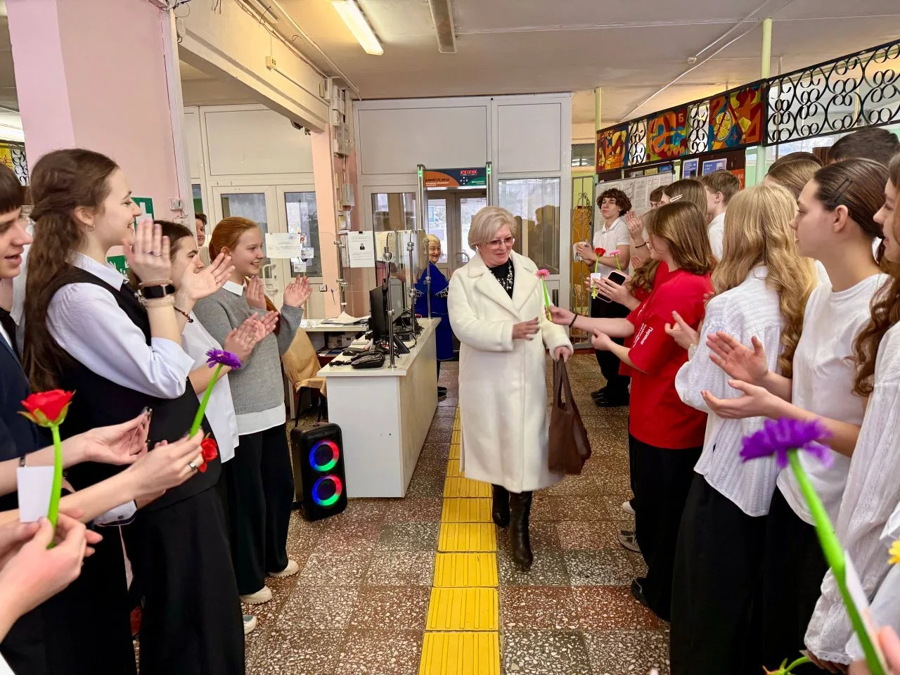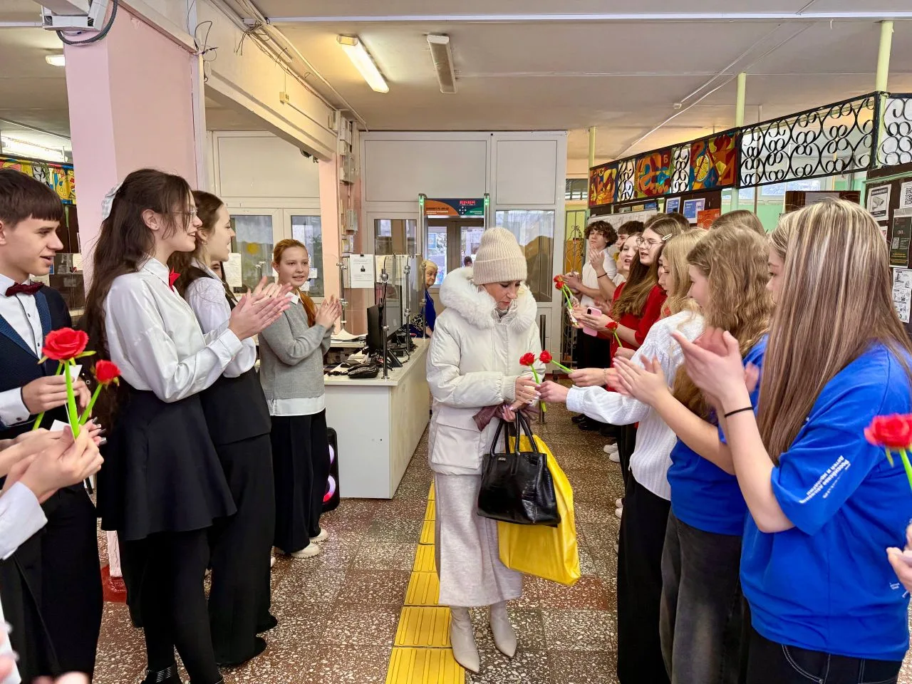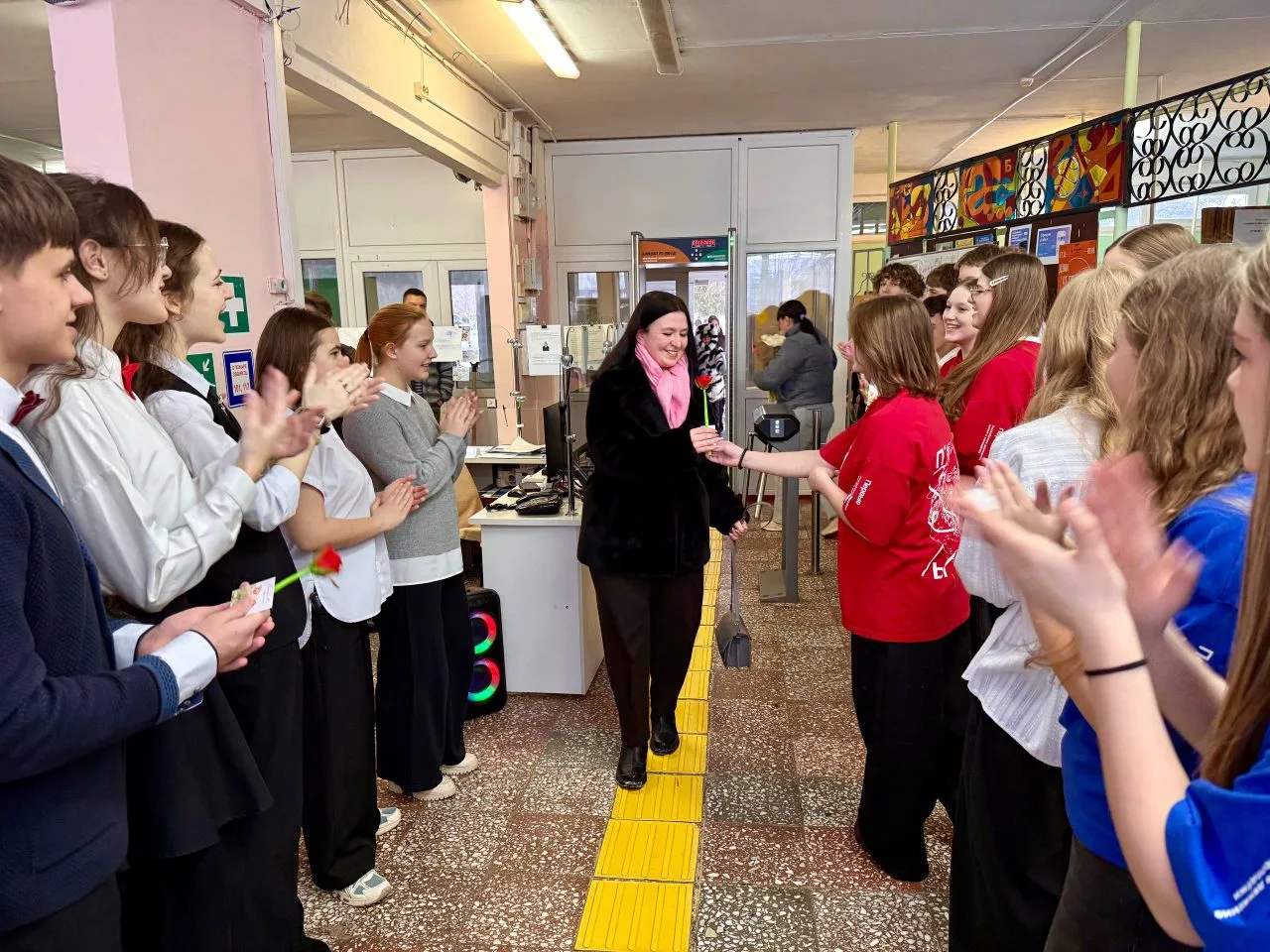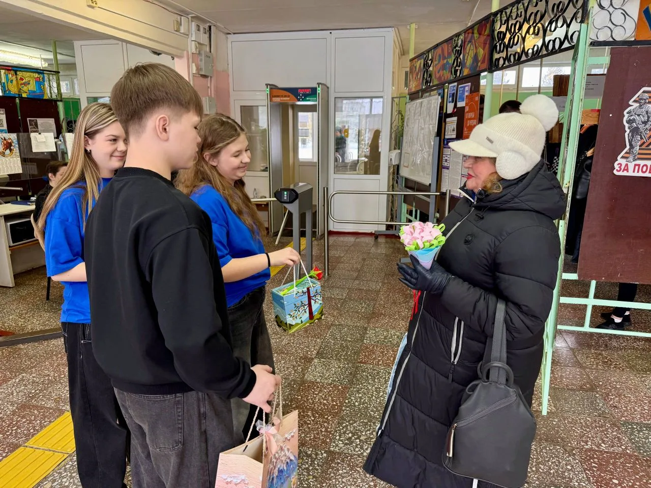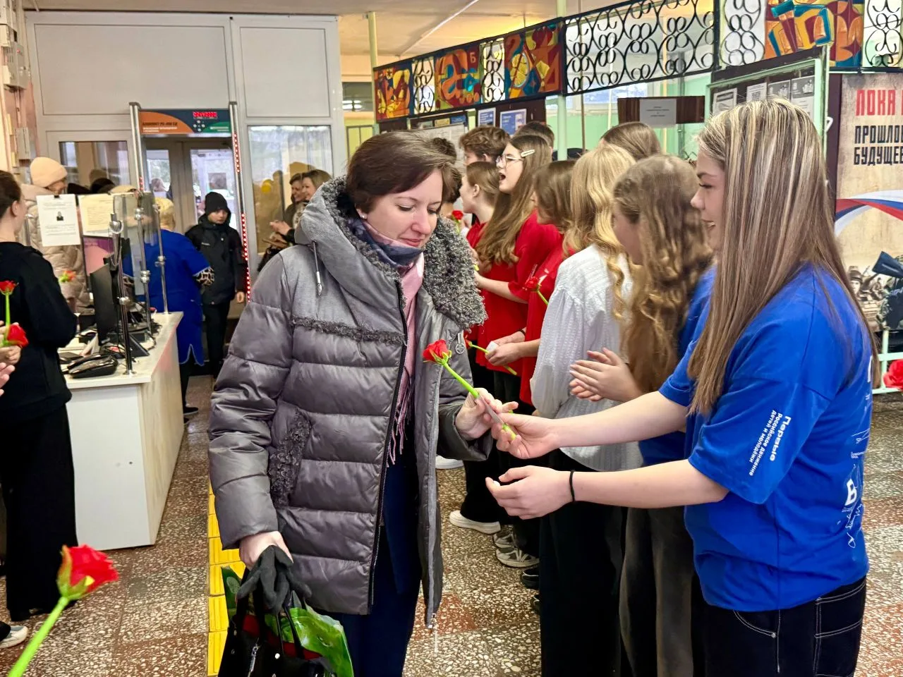 Утро в МБОУ " Лицей №5" началось с праздничных поздравлений женщин: старшеклассники , активисты "Движения Первых" под руководством советника директора организовали акцию " Тепло весеннего сердца" ,встречали учителей с музыкой, подарками и поздравляли своих педагогов, говорили им приятные слова.