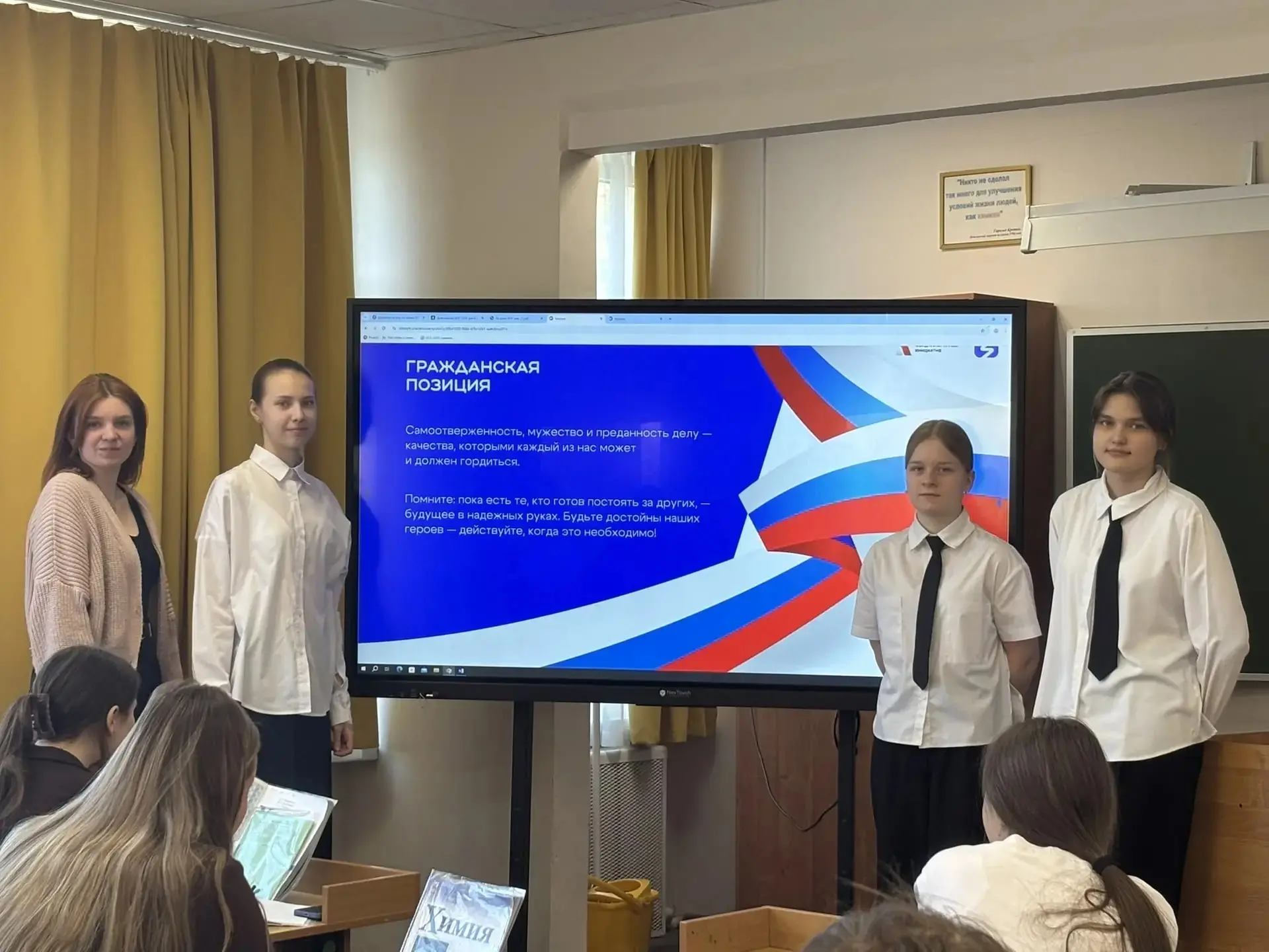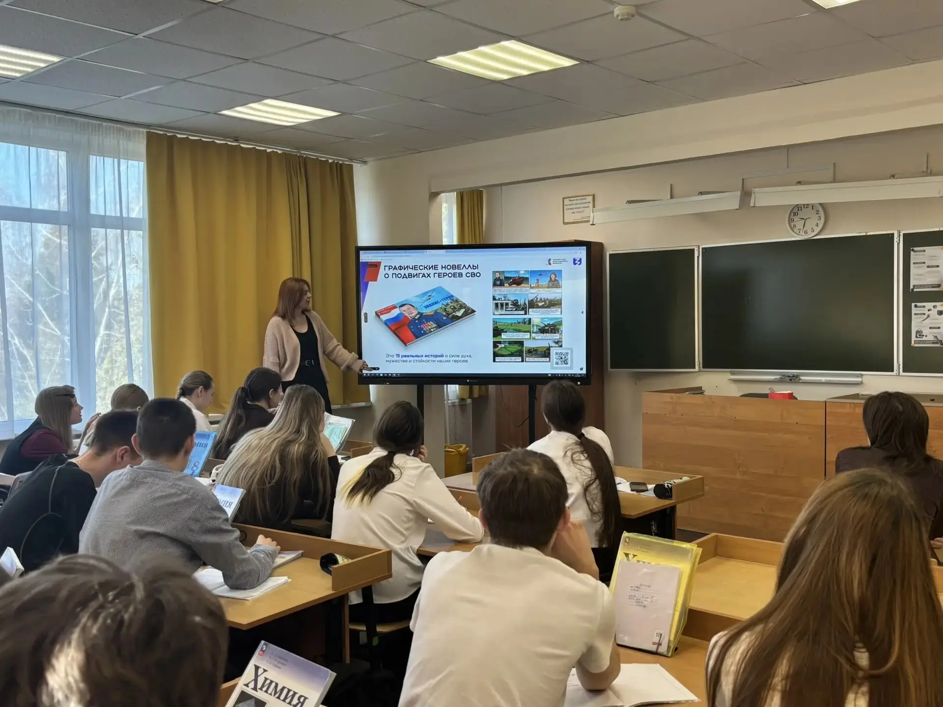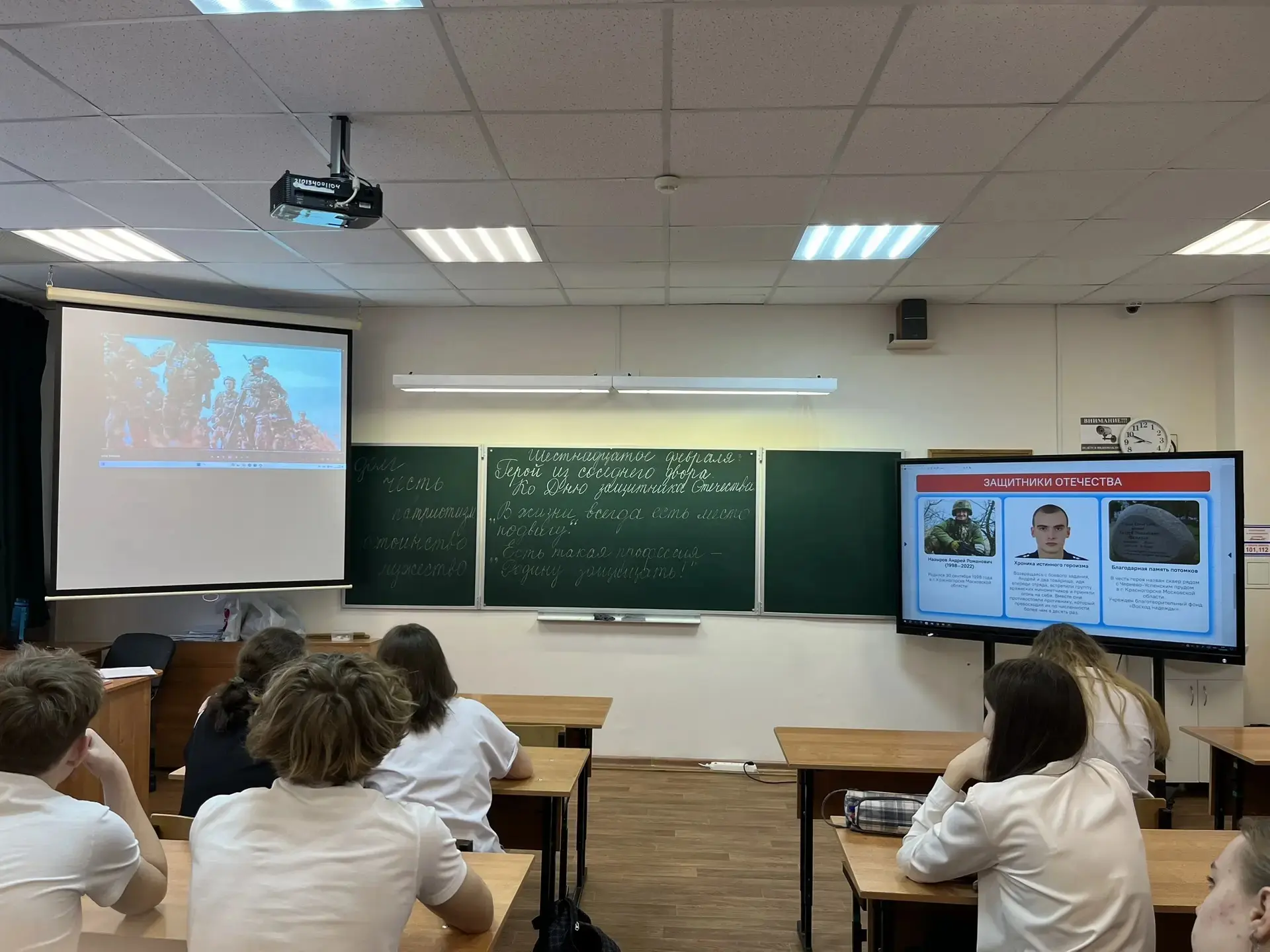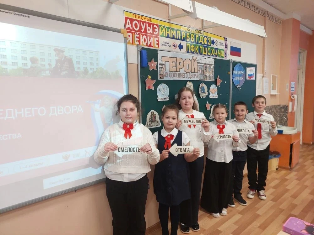Занятие из цикла «Разговоры о важном» было на тему «Герой из соседнего двора». Ученики обсуждали, что героизм проявляется не только в масштабных сражениях. Быть защитником Отечества — значит уметь брать на себя ответственность, приходить на помощь, заботиться о близких и быть честным перед собой и другими.