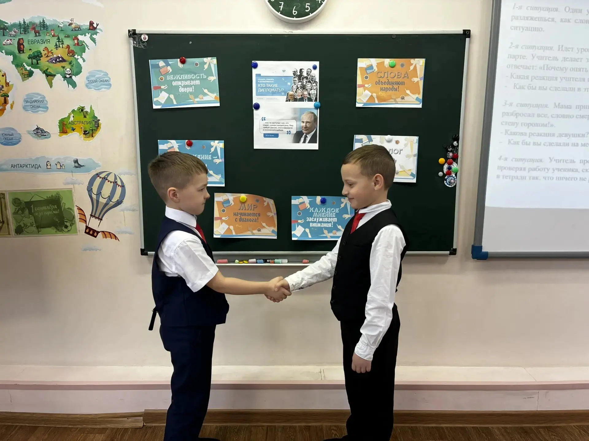 Цель занятия — познакомить учащихся с понятием дипломатии, ролью дипломатов в международных отношениях и их вкладом в защиту интересов страны. Также педагоги стремились развить у школьников навыки конструктивного диалога и умения находить компромиссы.