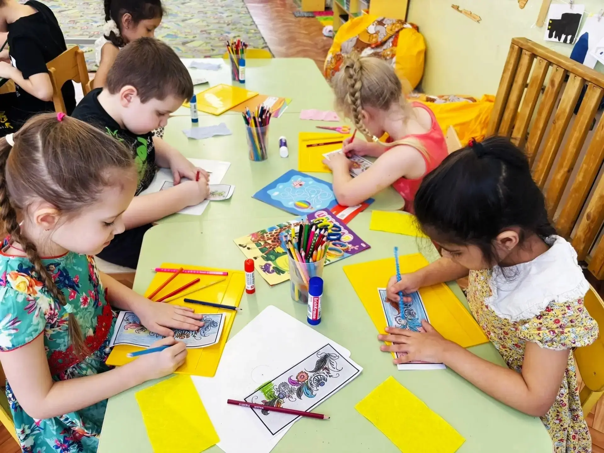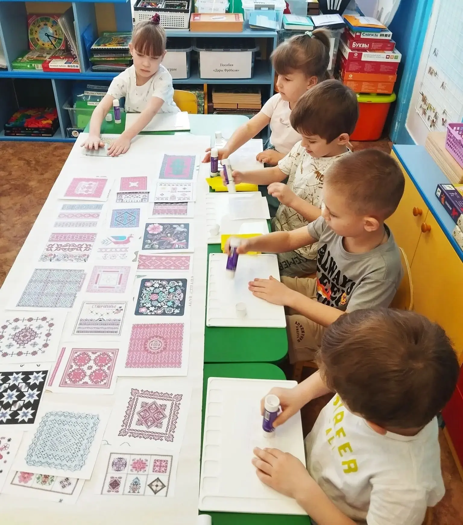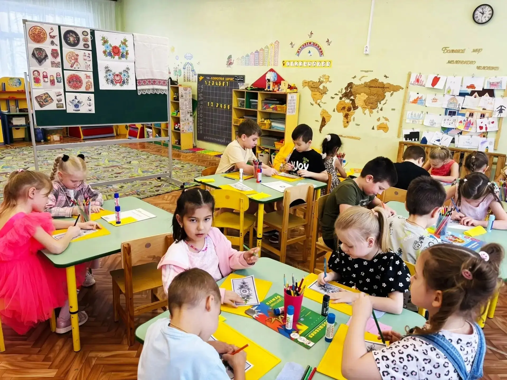 С интересом дошкольники занимались творческой работой, раскрашивая "Головные уборы", и сделав коллективную работу "Одеяло".
