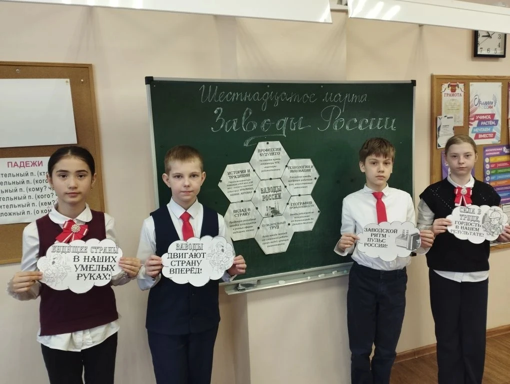 Вместе с ребятами обсудили, как создаются вещи, которыми мы пользуемся каждый день: от автомобилей и самолётов до бытовой техники и строительных материалов. Поговорили о том, какую роль играют заводы в развитии страны, почему современное производство — это не только станки и цеха, но и наука, технологии и труд людей разных профессий.