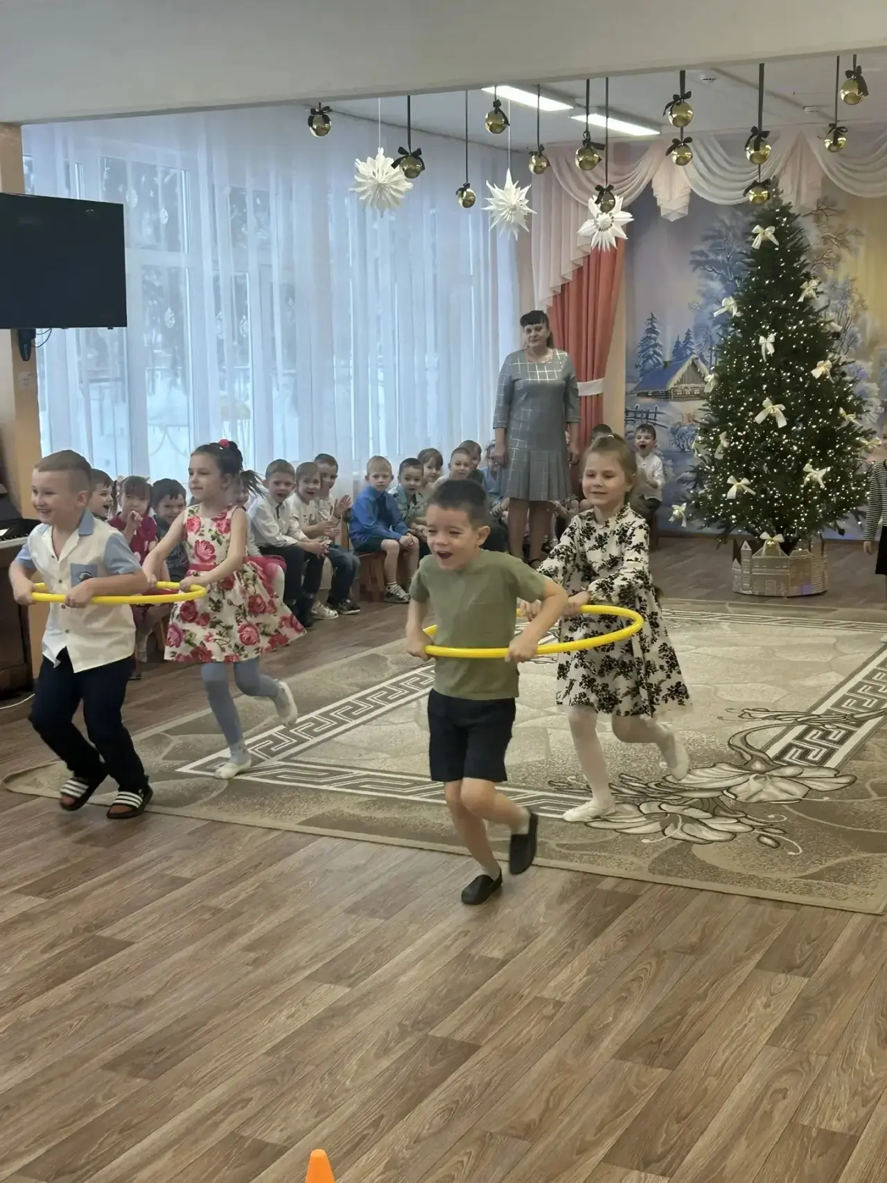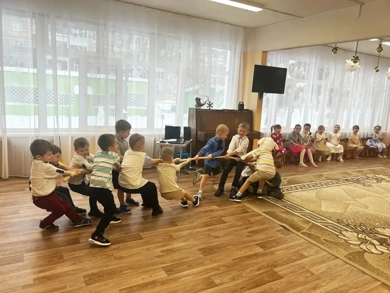 Дошкольники состязались в эстафетах "Перетягивание каната", "Кто быстрее?", "Не потеряй валенок!".