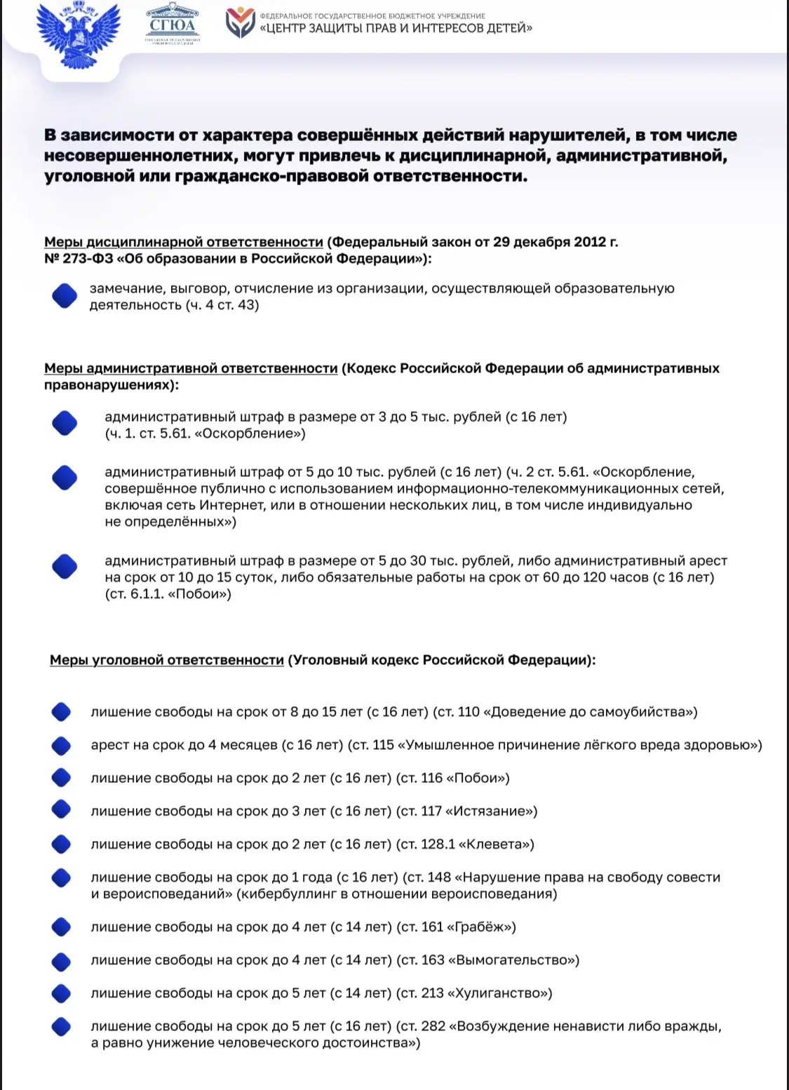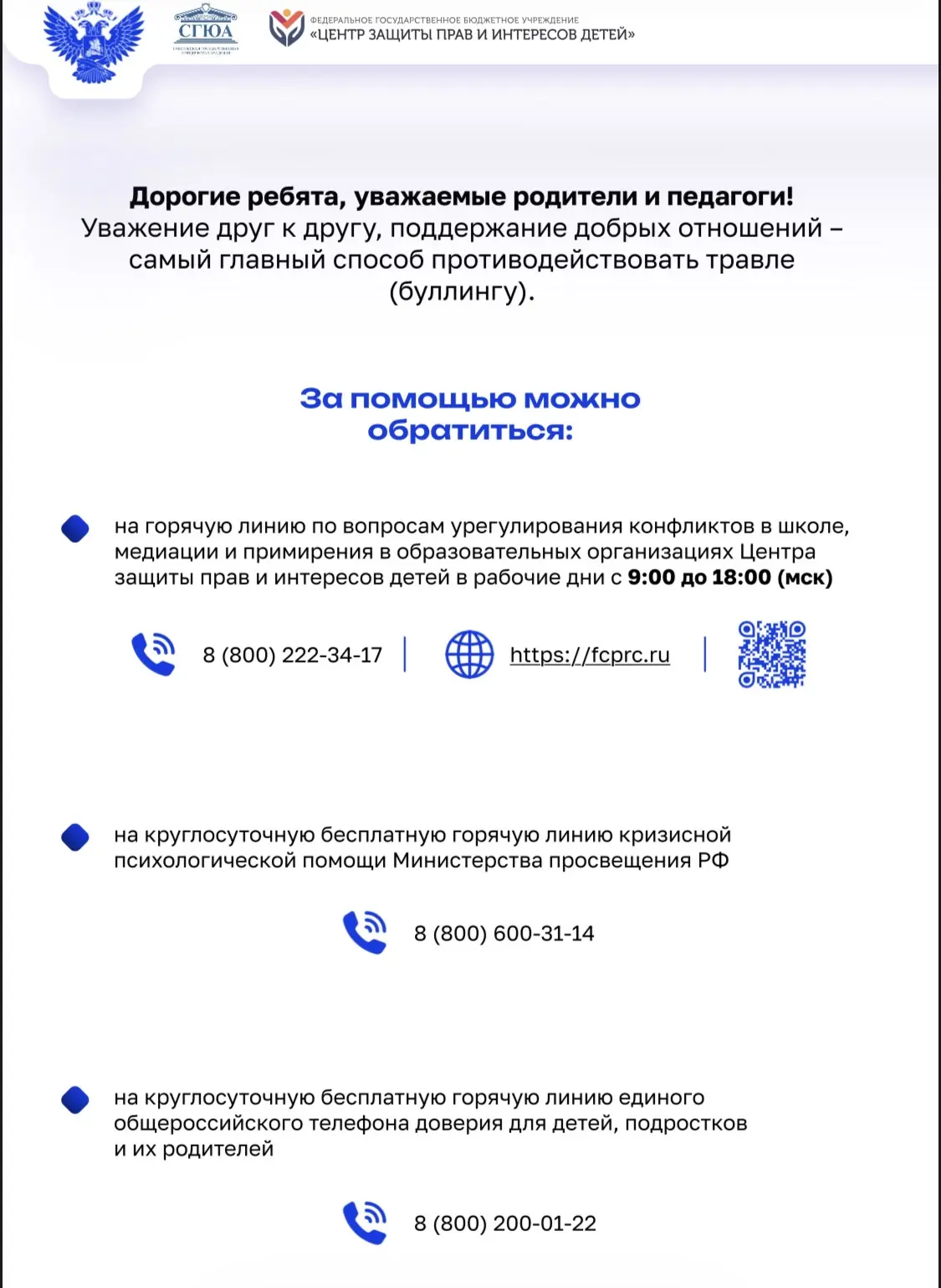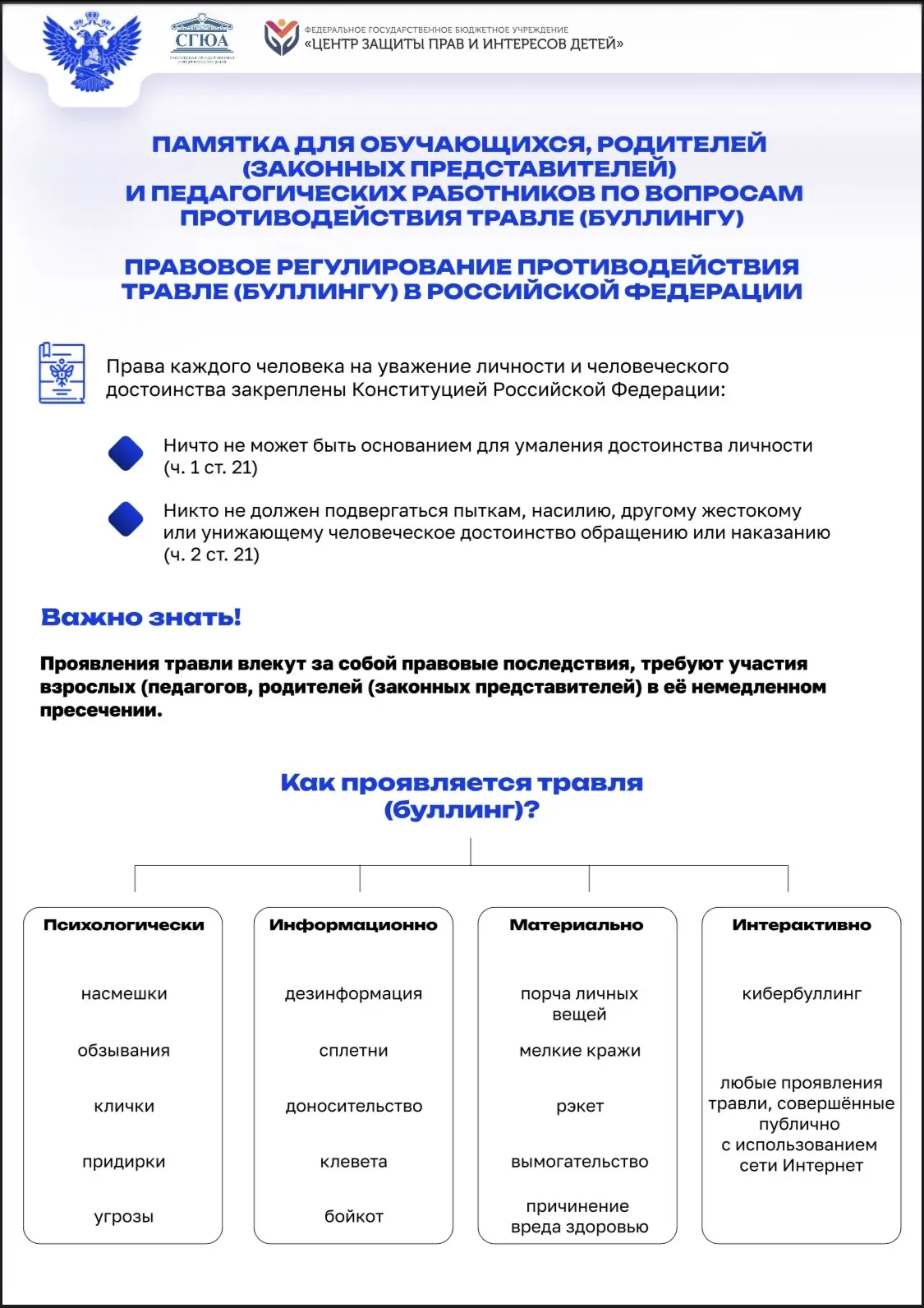 ❗️В соответствии с рекомендациями Министерства просвещения РФ и на основе памятки, разработанной совместно с Саратовской государственной юридической академией и Центром защиты прав и интересов детей, в нашей школе проводятся регулярные мероприятия, направленные на предупреждение буллинга.
