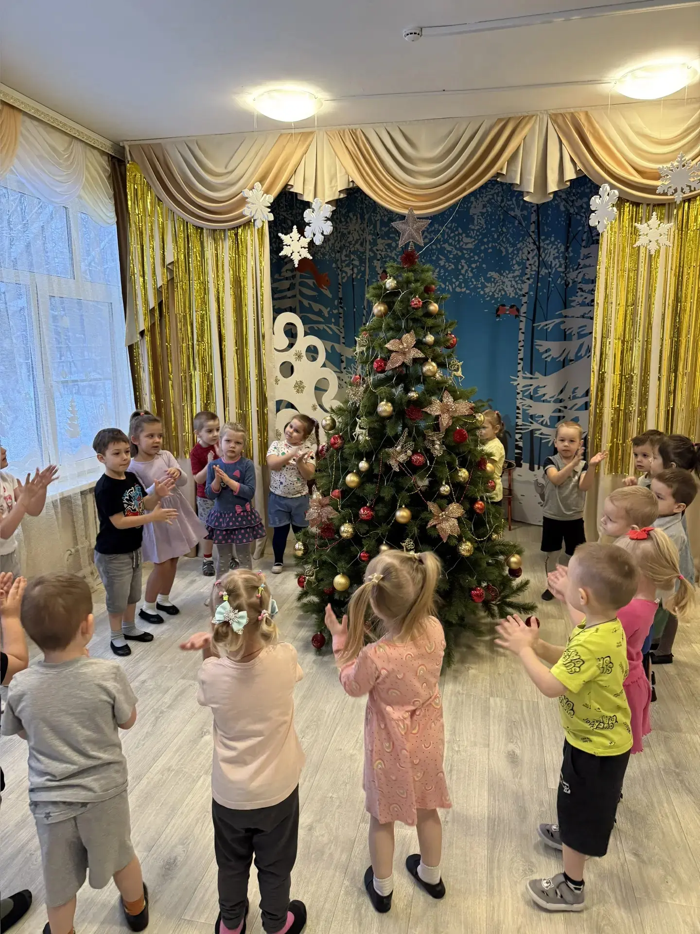 стоит украшенная ёлка 🎄- лесную красавицу просто так из детского сада отпустить нельзя, ведь она подарила детям столько радости!🤗 Вот и собрались вокруг ёлки наши ребята, чтобы попрощаться с ней до следующего Нового года🎄🎅🎉