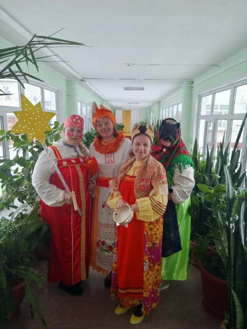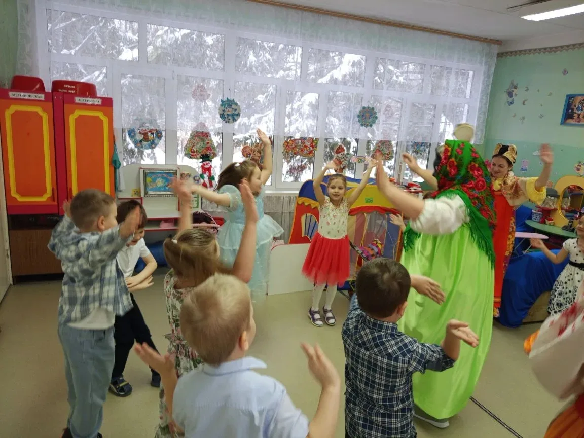 Дети подготовительной к школе группы и воспитатель Голикова М. П. с песнями и закличками, с пожеланиями богатства и счастья посетили ребят дошкольных групп. Хозяева были щедры: угощали гостей сладостями.