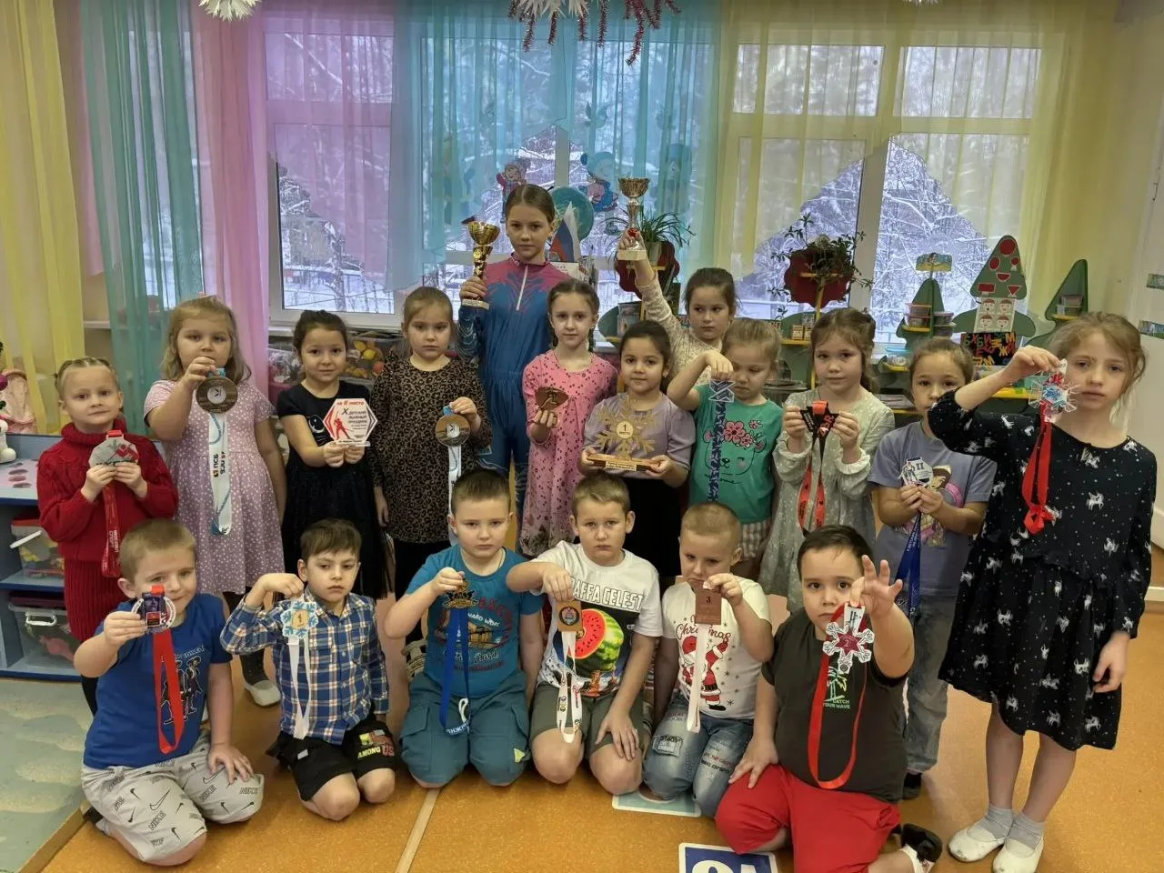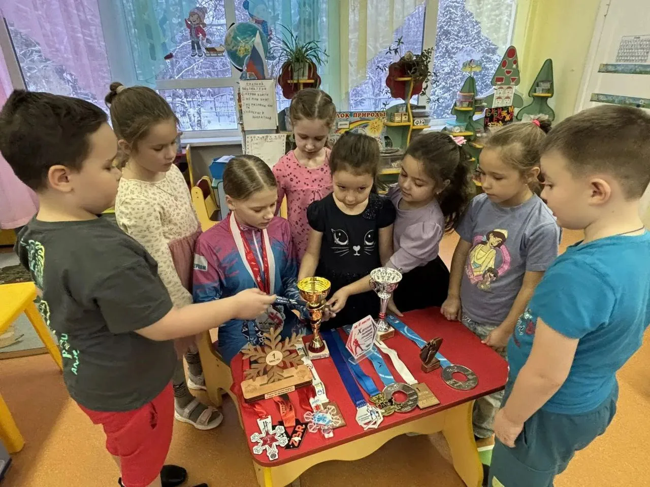 На занятие к детям пришла Анастасия М., ученица 6 класса, выпускница дошкольного отделения, которая рассказала, что занимается лыжными гонками с 5 лет, принимает участие в соревнованиях различного уровня, показала детям свои медали и кубки за спортивные достижения, познакомила с выдающимися лыжниками.
