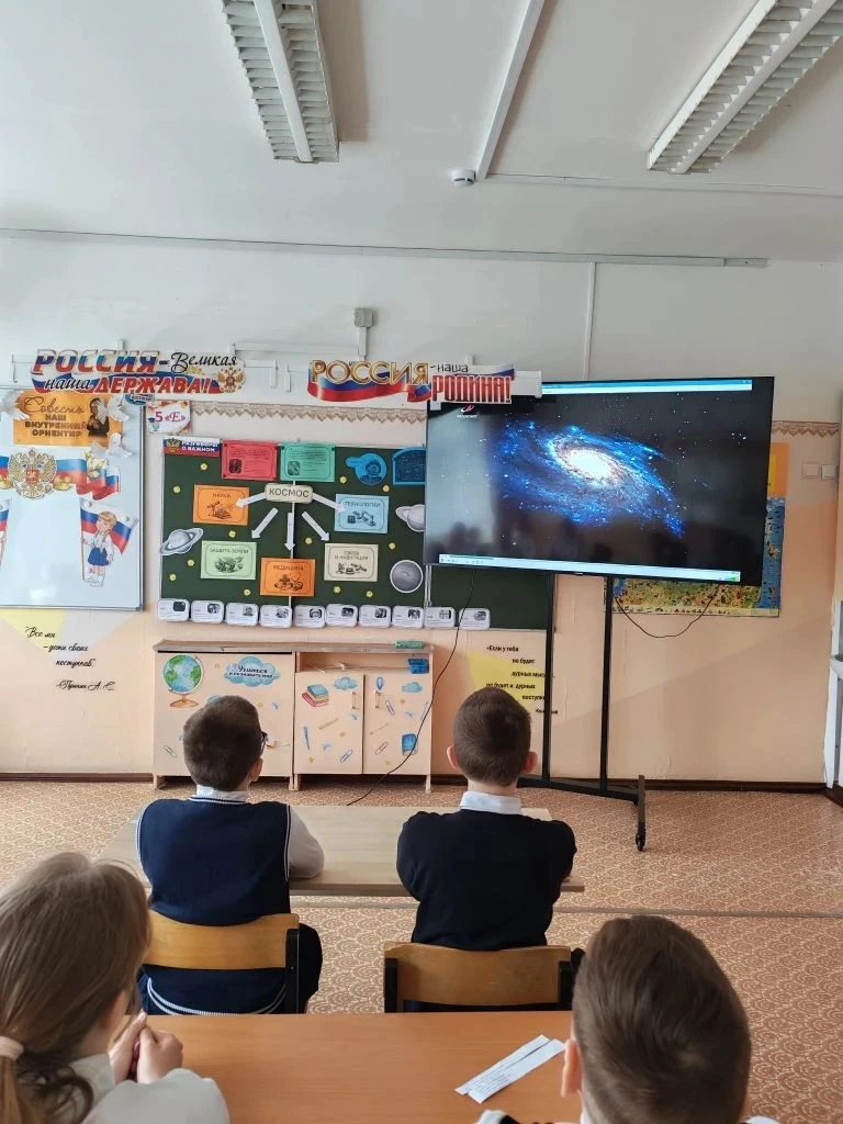 Ученики посмотрели видеоролики - «Зачем нам космос, если мы живем на Земле?» и «65 лет триумфа. Ко Дню космонавтики». Также поучаствовали в интерактивных заданиях: «Космические профессии» и «Наша космическая миссия».