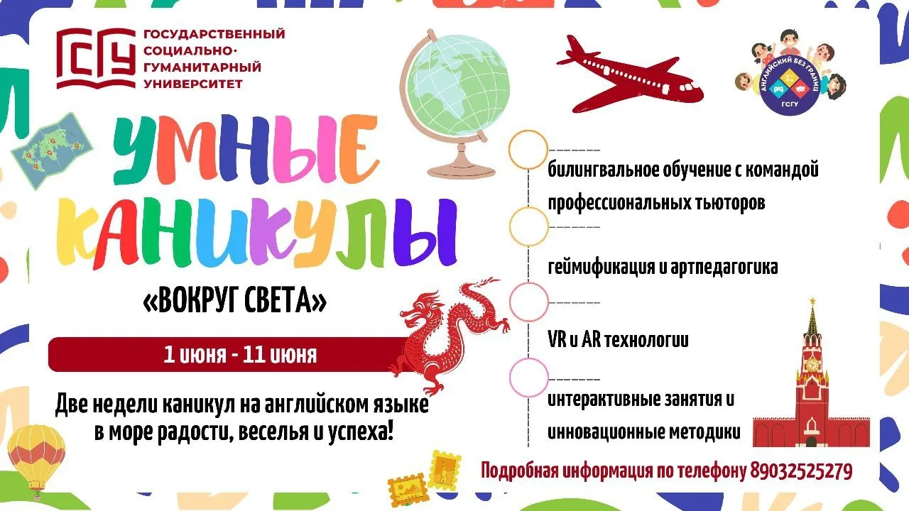 Проект ГСГУ «Английский без границ: умные каникулы» приглашает девчонок и мальчишек провести две недели летних каникул в путешествии «Вокруг света». Школьники легко усвоят иностранный язык и расширят свой кругозор.
