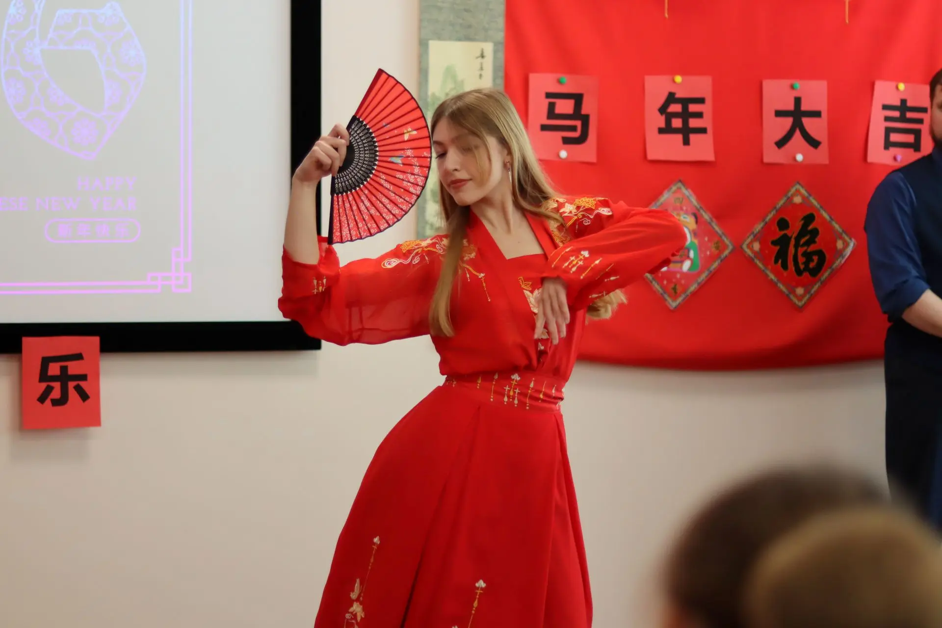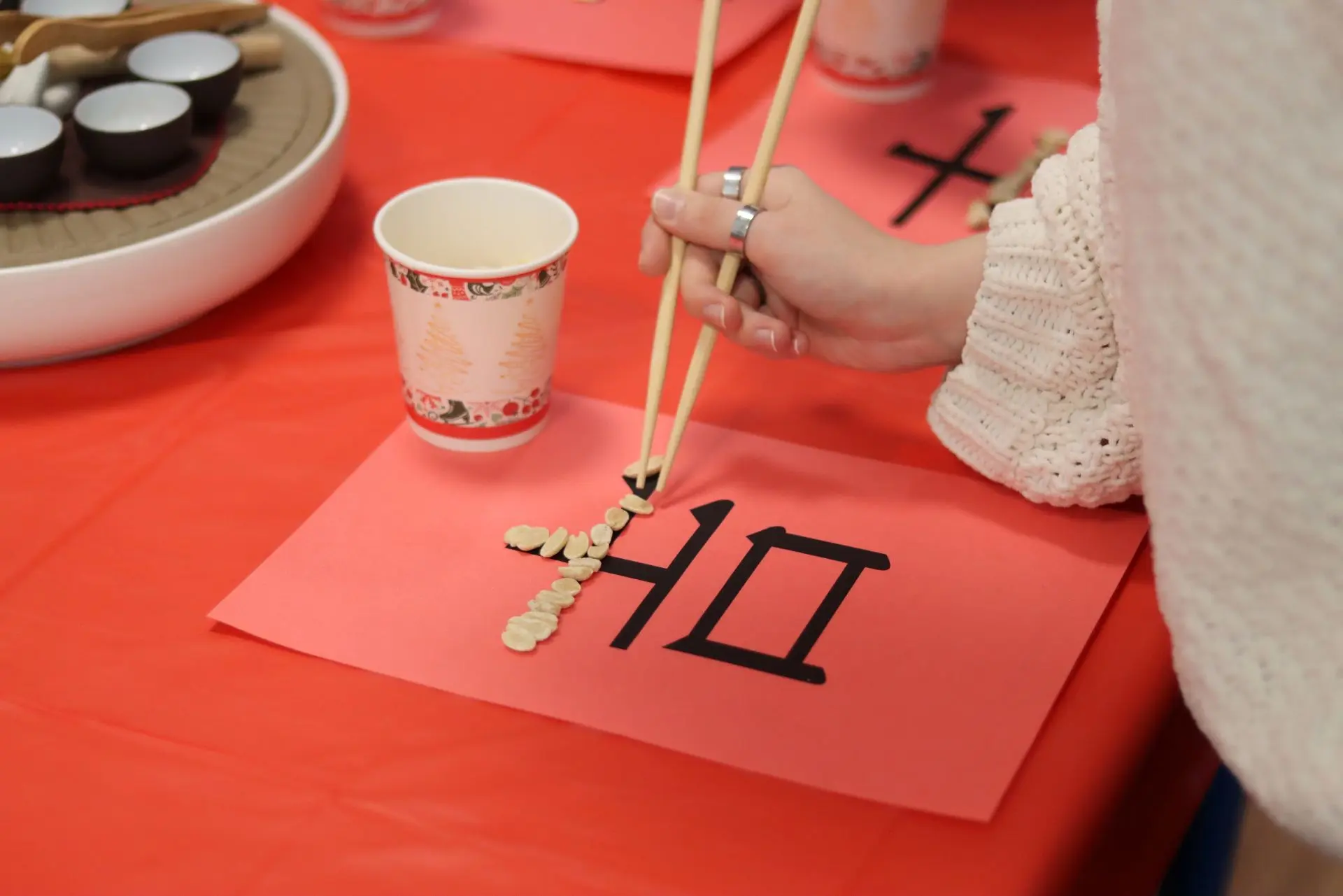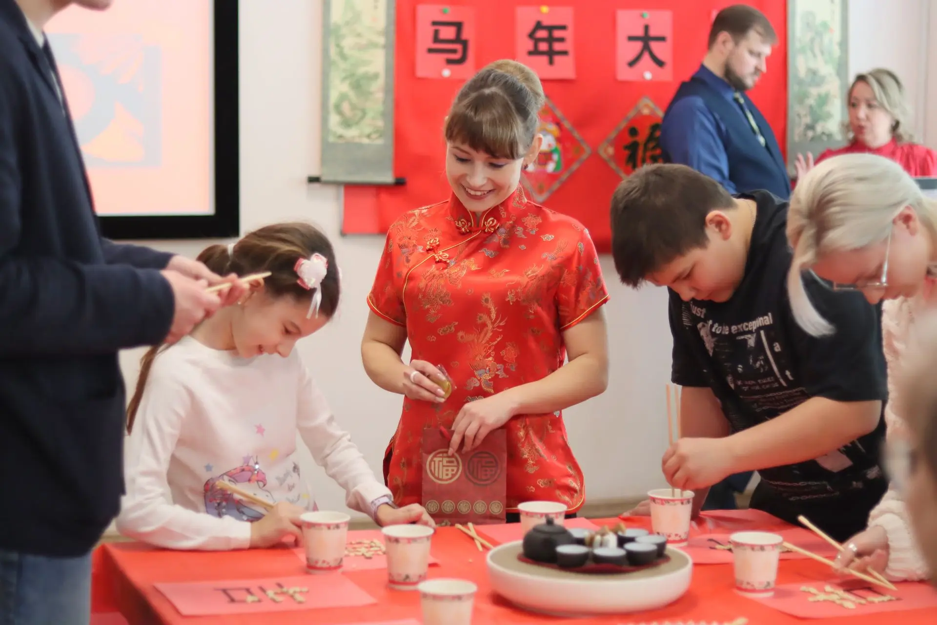 Новинка этого года – интерактив для гостей. Виртуозность владения китайскими палочками (куайцзы) проверили студенты и доцент Александра Андреевна Орлова, а преподаватели – Чжан Ти, Елизавета Олеговна Танасьева и Гоу Циэхун – научили поздравлять с новым годом на китайском.