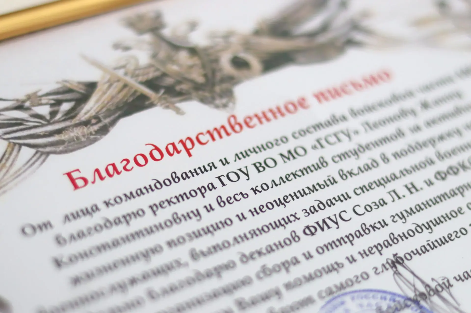 Из ГСГУ на Донбасс отправился УАЗ «Патриот», приобретенный на пожертвования сотрудников, преподавателей и студентов вуза. Внедорожник будет нести службу в 11-й десантно-штурмовой бригаде ВДВ, среди бойцов которой есть выпускники коломенского артучилища.