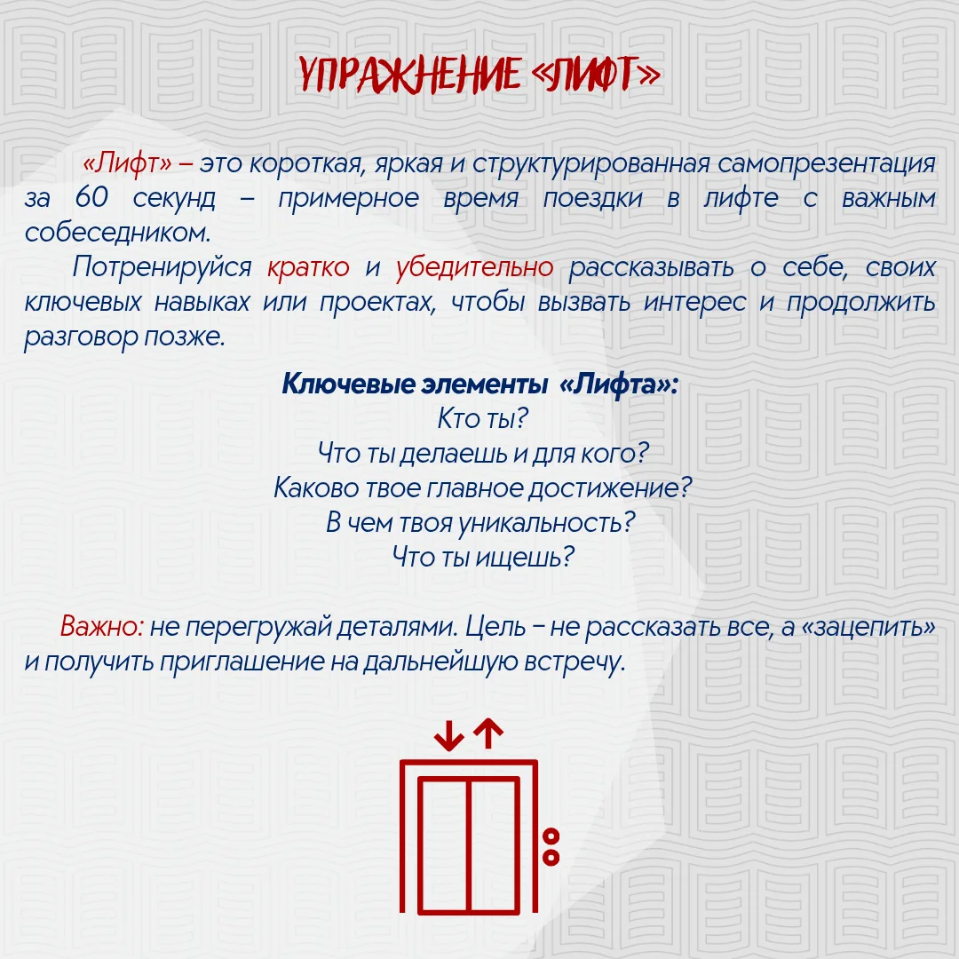 Чтобы подобных вопросов не возникало прямо на собеседовании, потренируйся говорить о себе заранее. (Можно даже в лифте. 😁)