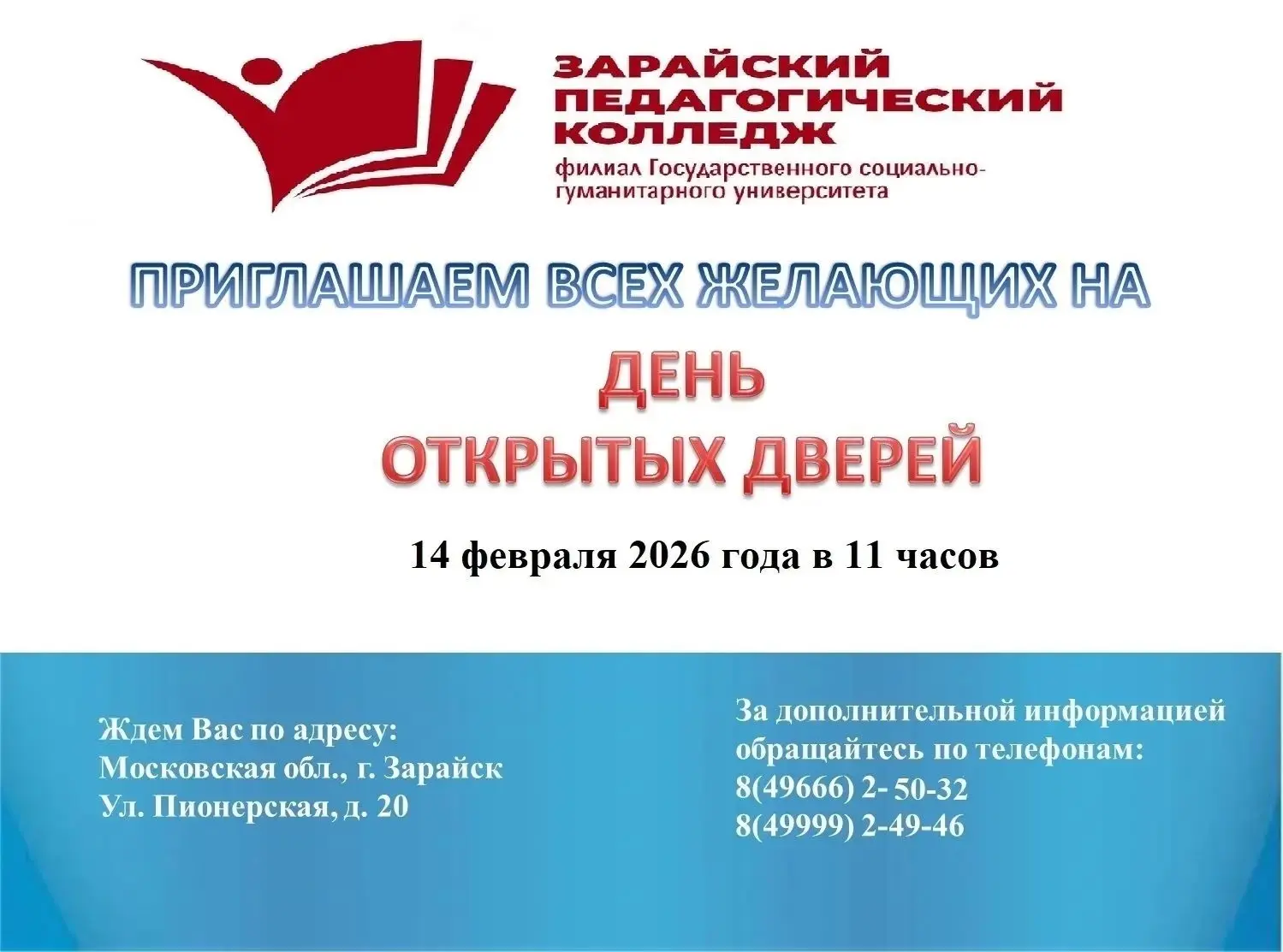 В субботу, 14 февраля, пройдет День открытых дверей в филиале ГСГУ – Зарайском педагогическом колледже. Начало в 11:00.