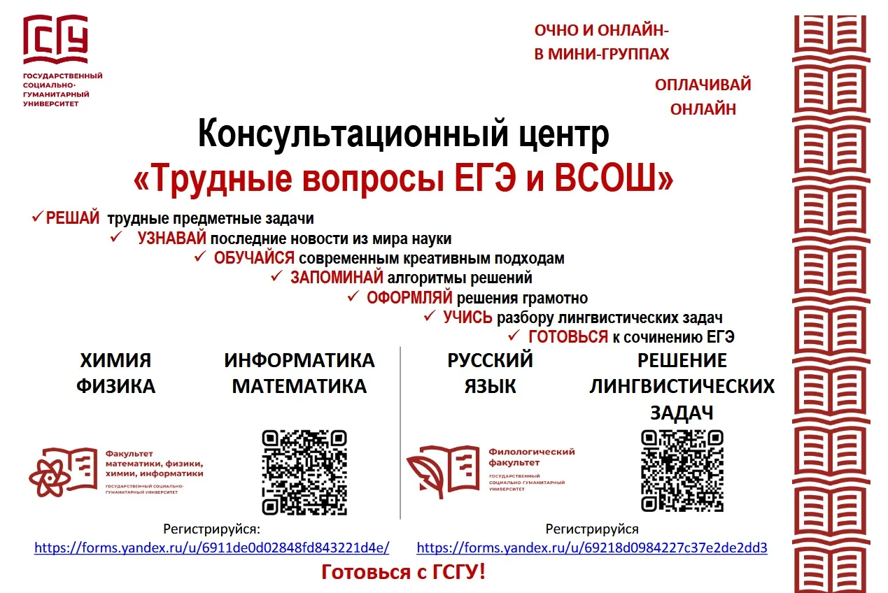 В ГСГУ продолжает работу консультационный центр «Трудные вопросы ЕГЭ и ВСоШ» для старшеклассников. Опытные преподаватели физмата и филфака делятся со старшеклассниками секретами успешной сдачи экзаменов и побед на олимпиадах.