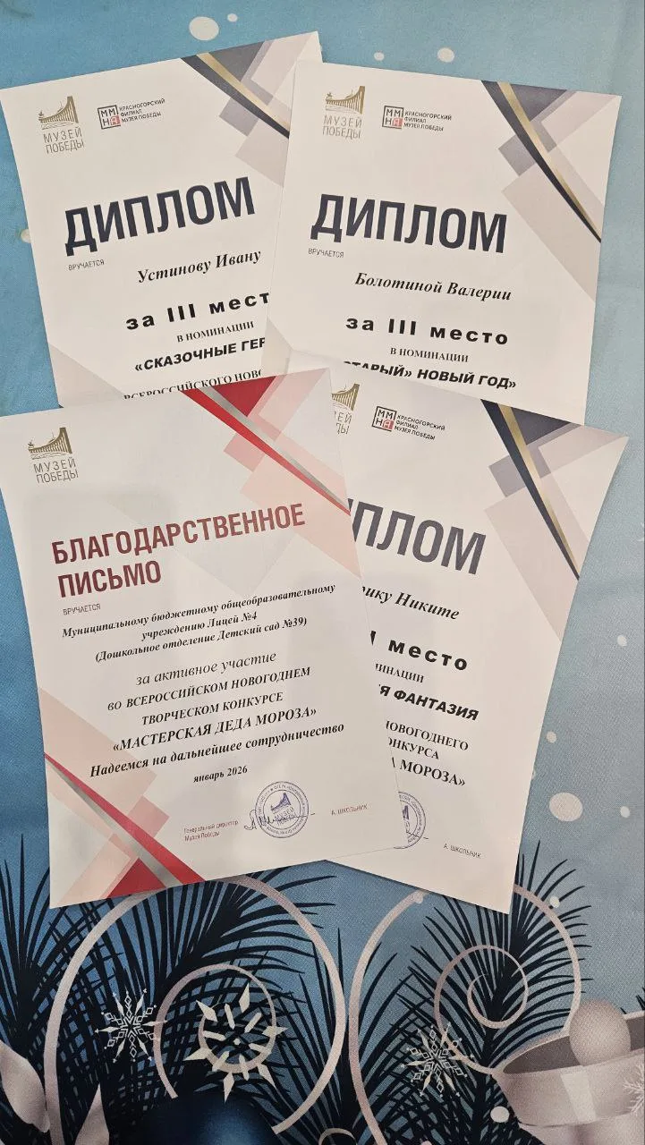 🎄17 января в Красногорском филиале Музея Победы состоялась торжественная церемония награждения победителей Всероссийского конкурса семейного творчества «Мастерская Деда Мороза». И мы безмерно горды, что среди лучших — воспитанники дошкольного отделения МБОУ лицей №4 (д/с №39)!