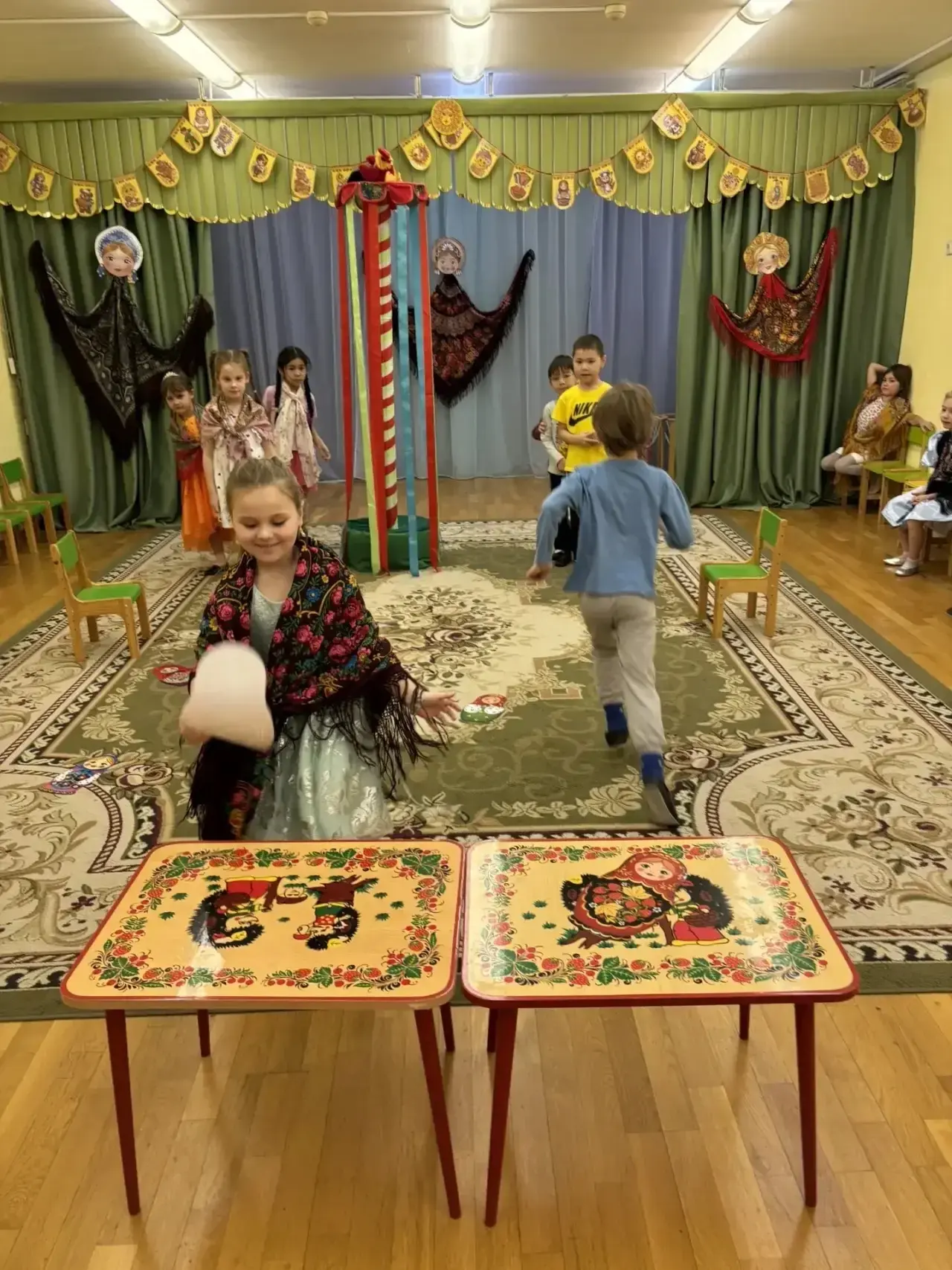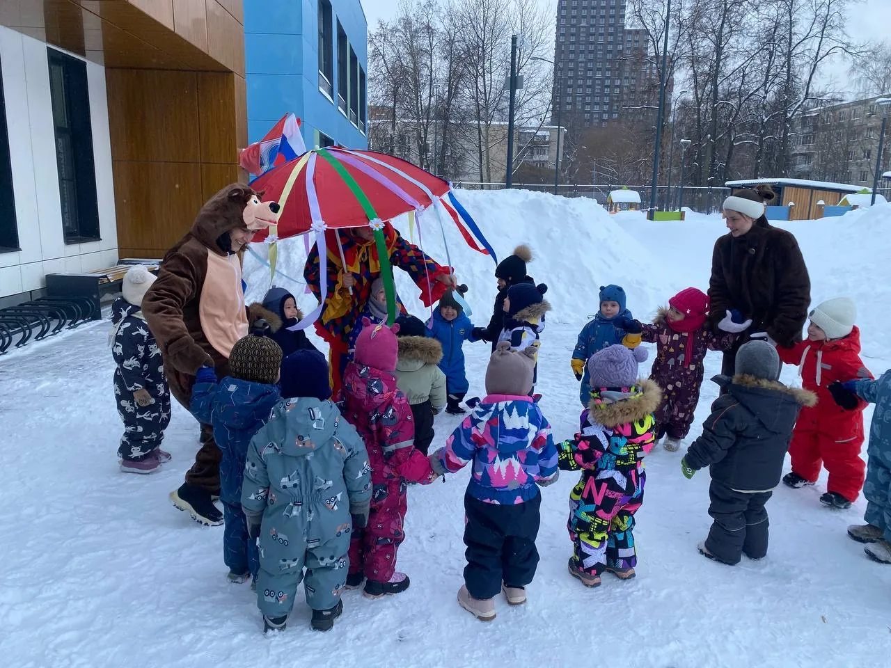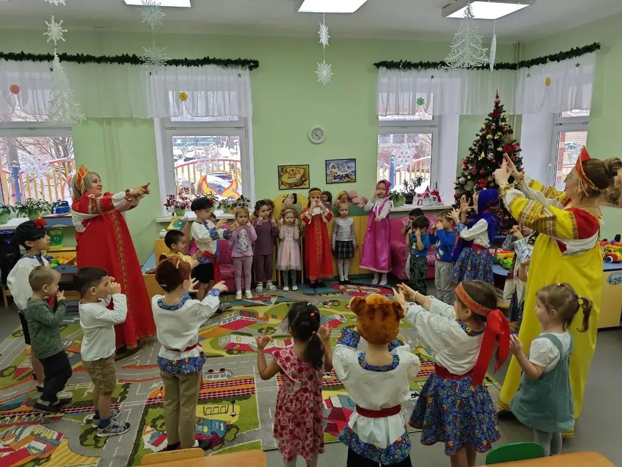Наши звезды из подготовительной группы зарядили всех праздничным настроением! 🌟 Они ходили по группам, выразительно читали стихи, играли с малышами в веселые игры и водили настоящий дружный хоровод! 💃🕺