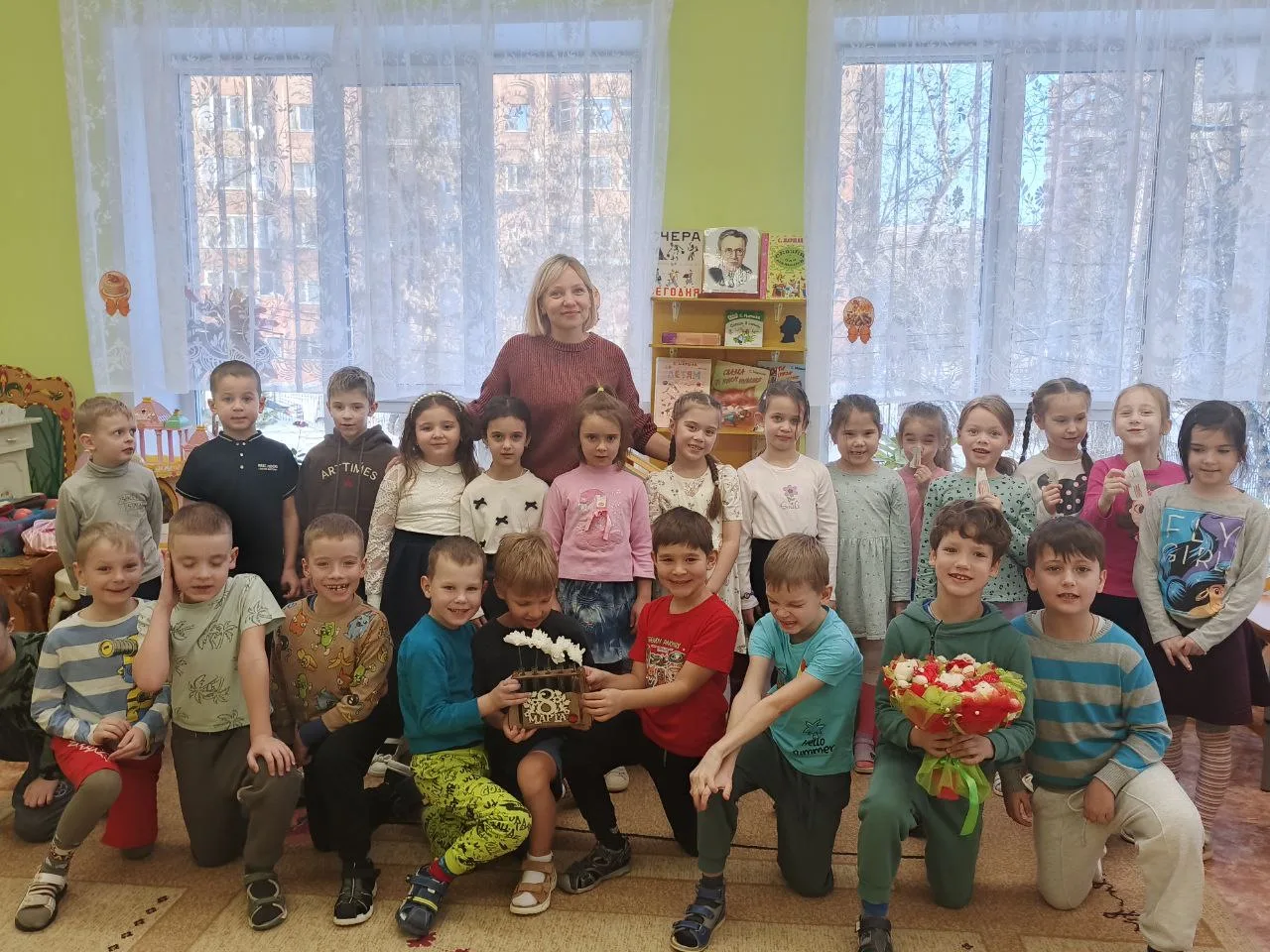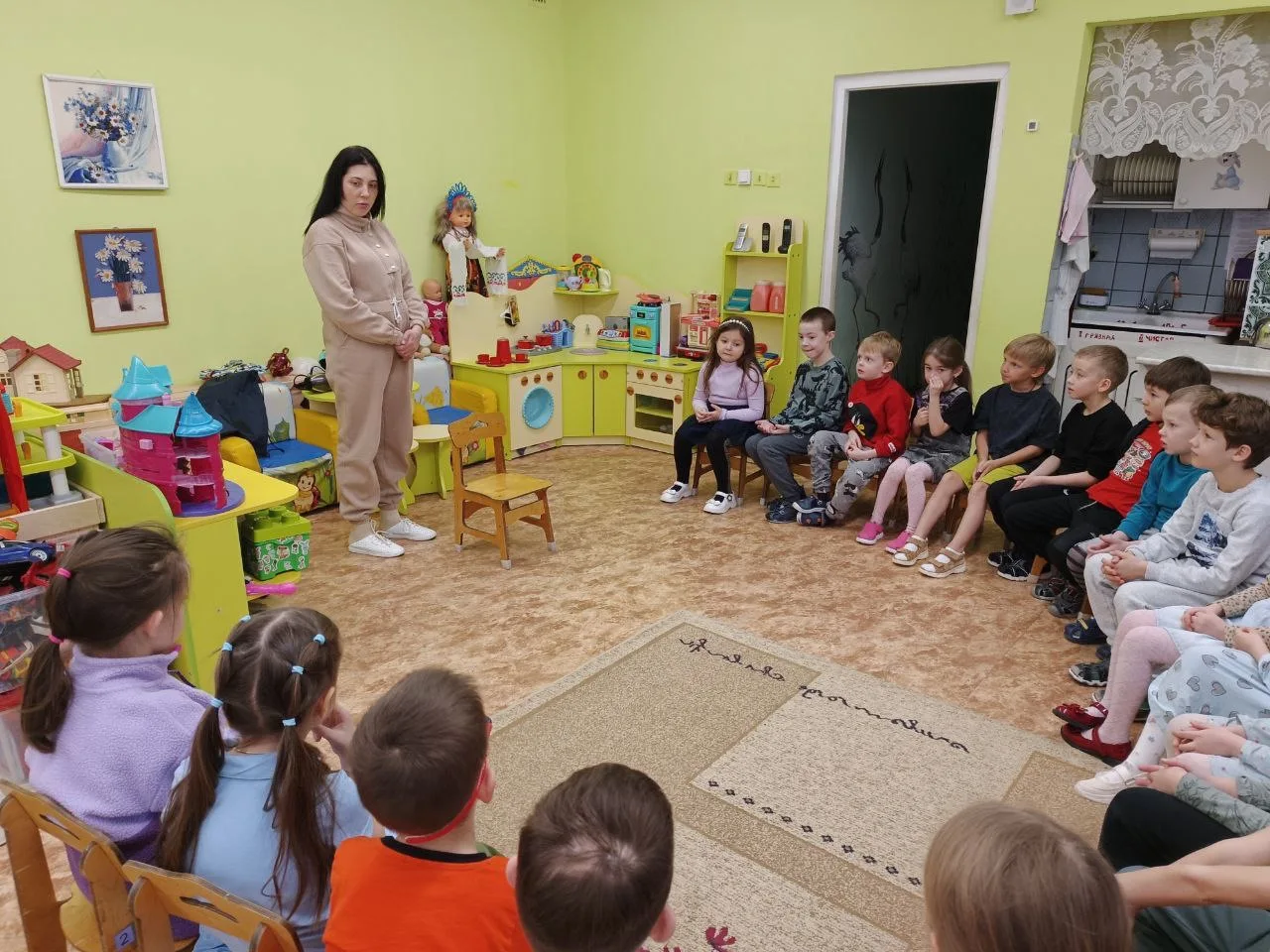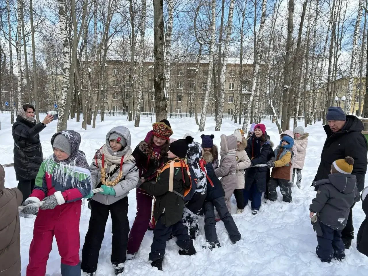 Наши звезды из подготовительной группы зарядили всех праздничным настроением! 🌟 Они ходили по группам, выразительно читали стихи, играли с малышами в веселые игры и водили настоящий дружный хоровод! 💃🕺