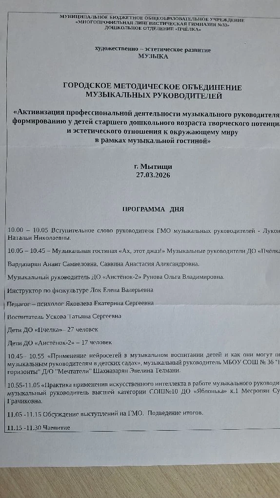 📌📚Новости дошкольных отделений🎼🎷27 марта в ДО "Пчелка" корпус №2 состоялось городское методическое обьединение для музыкальных руководителей городского округа Мытищи «Активизация профессиональной деятельности музыкального руководителя по формированию у детей старшего дошкольного возраста творческого потенциала и эстетического отношения к окружающему миру в рамках музыкальной гостиной».🎹 Мероприятие подготовили музыкальные руководители ДО "Пчёлки" 1 - 2 и "Аистёнка"-2 Савина А.А. Вардазарян А.С., Рунова О.В. Так же принимали участие воспитатели , инструктора по физкультуре, учителя - логопеды и педагог - психолог. Специалисты представляли новую форму работы с родителями и детьми - музыкальная гостинная.🎺 27 марта в стенах детского сада звучал джаз.🎷 Гости отправились в путешествие по истории джаза начиная с его зарождения и заканчивая современностью. Роковая красотка в вечернем платье пела для гостей джазовые мелодии, а джентльмены создавали атмосферу волшебства. Гости активно вовлекались в действие: пели спиричуэлс и танцевали вместе с детьми.🎤🎼 Такой подход направлен на приобщение к музыкальной культуре родителей и детей и гармонизацию детско-родительских отношений через участие в совместных творческих мероприятиях.