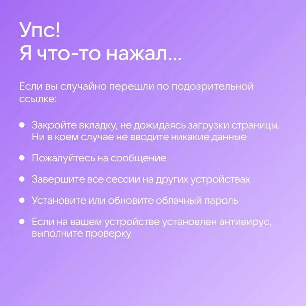 ❓Как не попасться и что делать, если аккаунт всё же взломали, — рассказали в карточках.