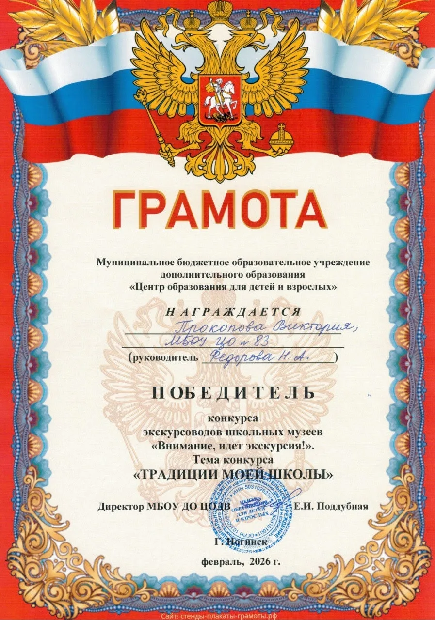 Сегодня, 25.02.2026 г. прошел муниципальный конкурс экскурсоводов «Внимание, идет экскурсия!» В нем приняли участие 11 школ. ЦО № 83 представляла ученица 7 «Г» класса Прокопова Виктория под руководством Федоровой Н. А. Тема конкурса была очень интересной: «Традиции нашей школы». В своем исследовании мы попытались проследить развитие традиции в Тимковской школе туристско-краеведческой работы на основе рукописных журналов школьников 60-ых – 80-ых годов 20 века. Также мы подтвердили, что эта традиция продолжает развиваться и в наши дни. Разработанная нами экскурсия получилась не только полезной, но и увлекательной для слушателей. Жюри высоко оценило нашу работу и вручило грамоту победителей!