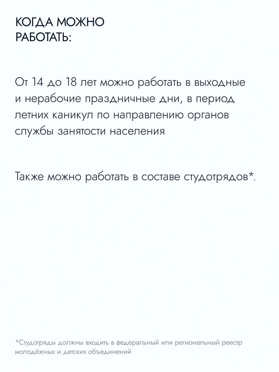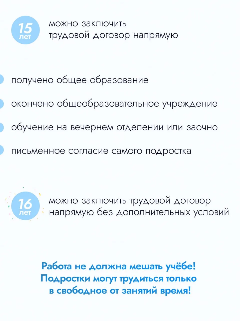 «Обязательно вместе с ребёнком изучите вакансию и условия. Убедитесь, что оформлен трудовой договор. Проговорите безопасный маршрут до места работы и правила поведения. Не соглашайтесь на работу без договора. Не стесняйтесь обращаться в Кадровый центр за профориентацией – тесты и консультации помогут понять, кем вы хотите стать в будущем. Обязательно советуйтесь с родителями. Ваша безопасность важнее первой зарплаты», – подчеркнула Уполномоченный по правам ребёнка в Московской области Ксения Мишонова.