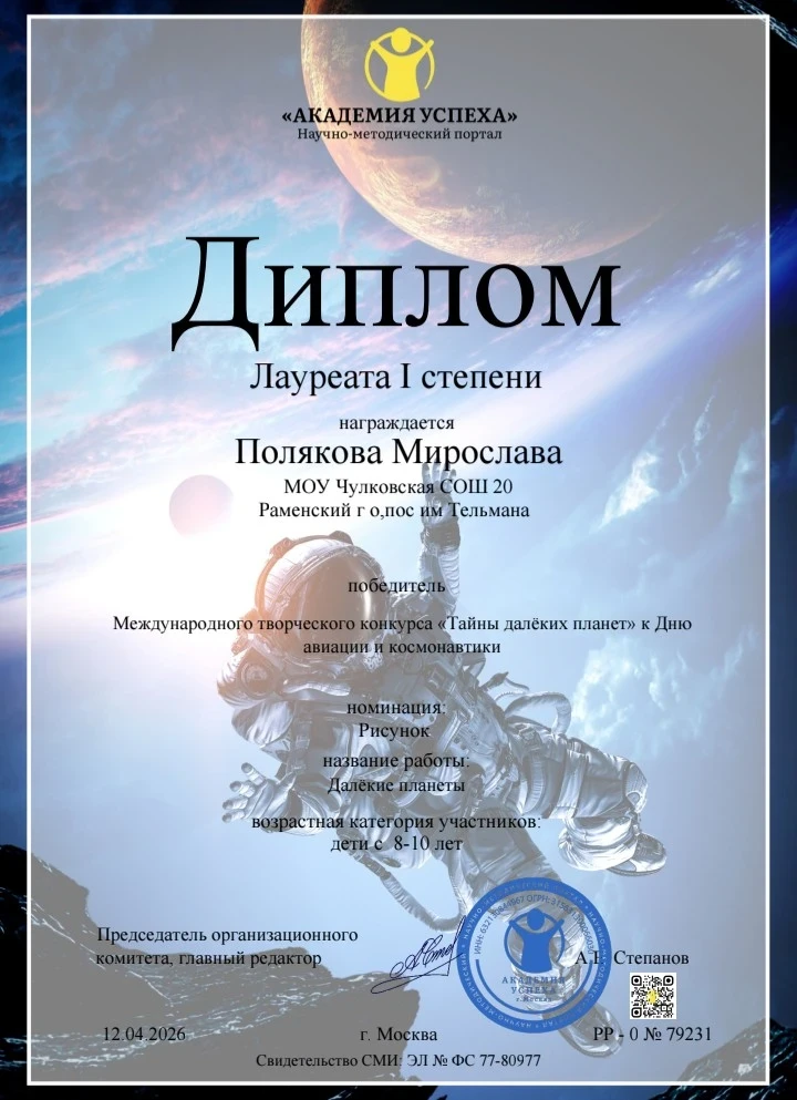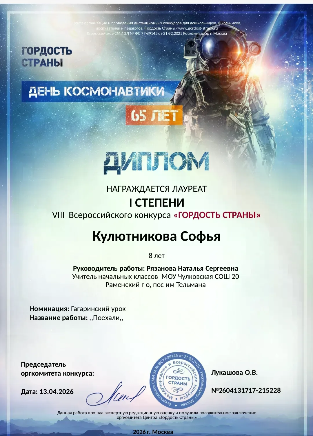 Поздравляем учениц 1в Кулютникову Софью, Полякову Мирославу и их руководителя Рязанову Н.С. с победой в творческих конкурсах, посвященных Дню космонавтики.