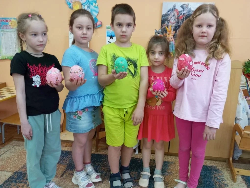 Ребята изготовили пасхальные яйца в технике гипсопластика с помощью воздушного шарика и гипсового бинта, раскрасили красками и украсили наклейками.