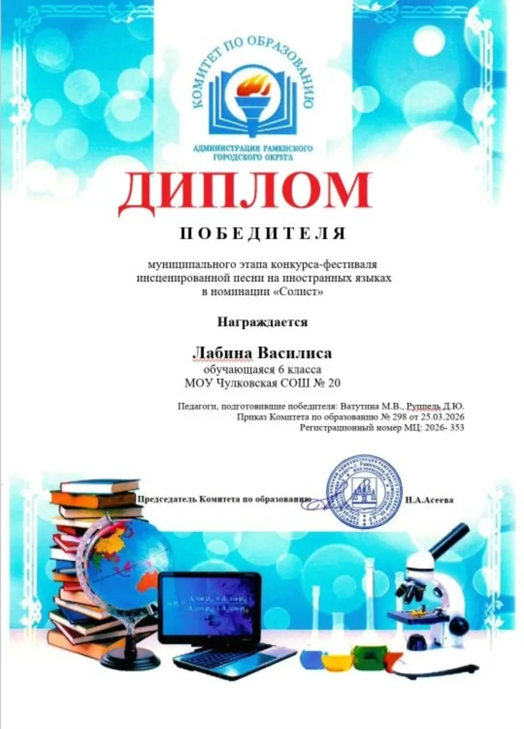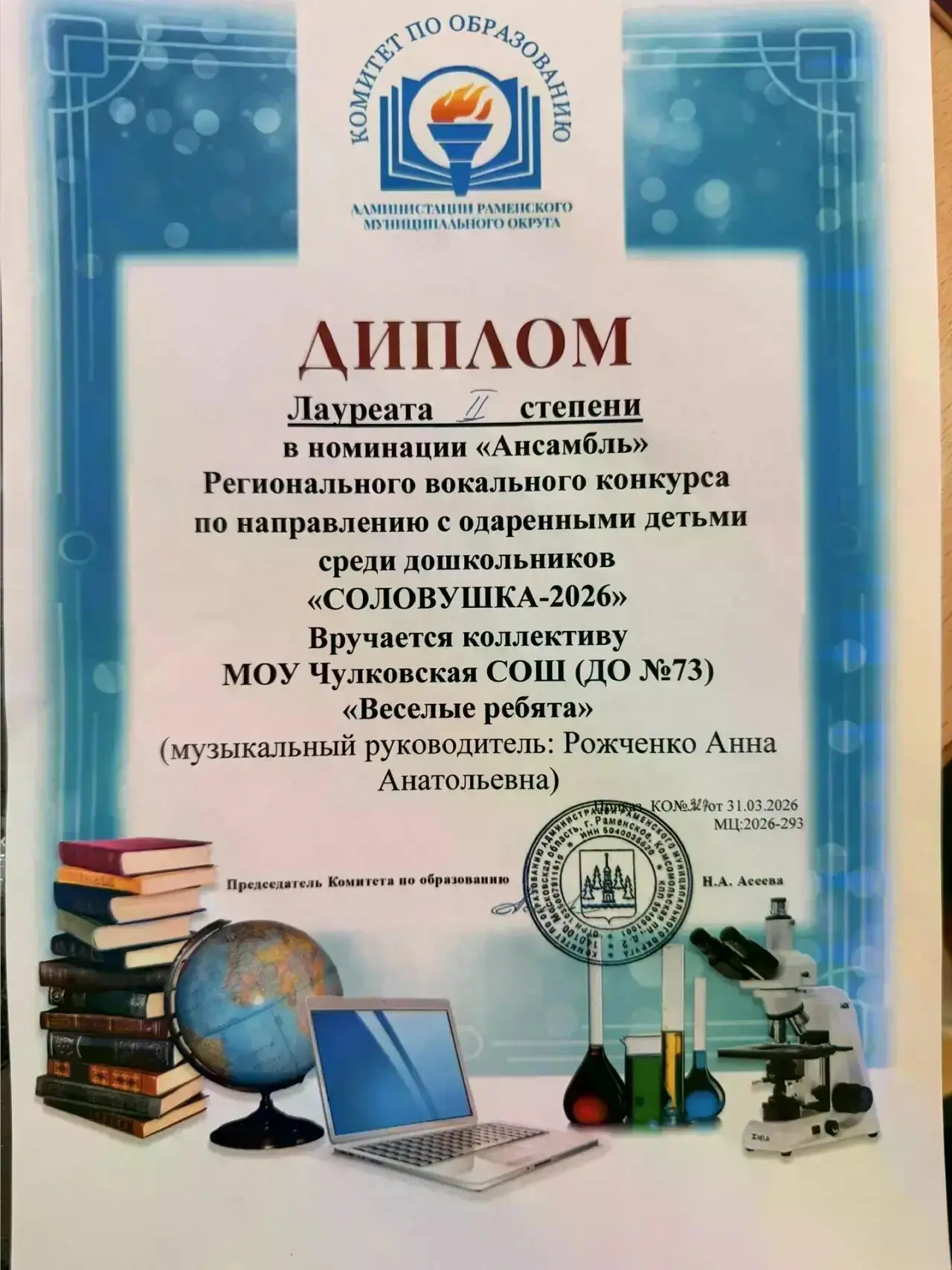 В соответствии с планом Комитета по образованию и МОУ ДПО "МЦ" Раменский дом учителя" на базе МОУ "Гимназия г. Раменское" (ДО 53) 31 марта 2026 года прошел финал регионального вокального конкурса "Соловушка", где приняли участие более 50 детских дошкольных отделений из разных городов Московской области (Раменское, Люберцы, Жуковский, Бронницы, Воскресенск).