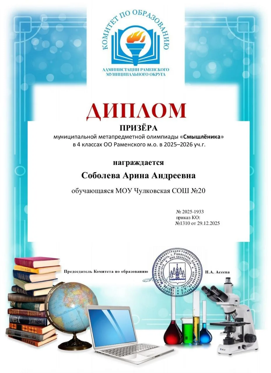 Поздравляем Соболеву Арину , ученицу 4а класса (кл.рук. Ляпунова С.С.) , которая стала ПРИЗЕРОМ олимпиады!!!