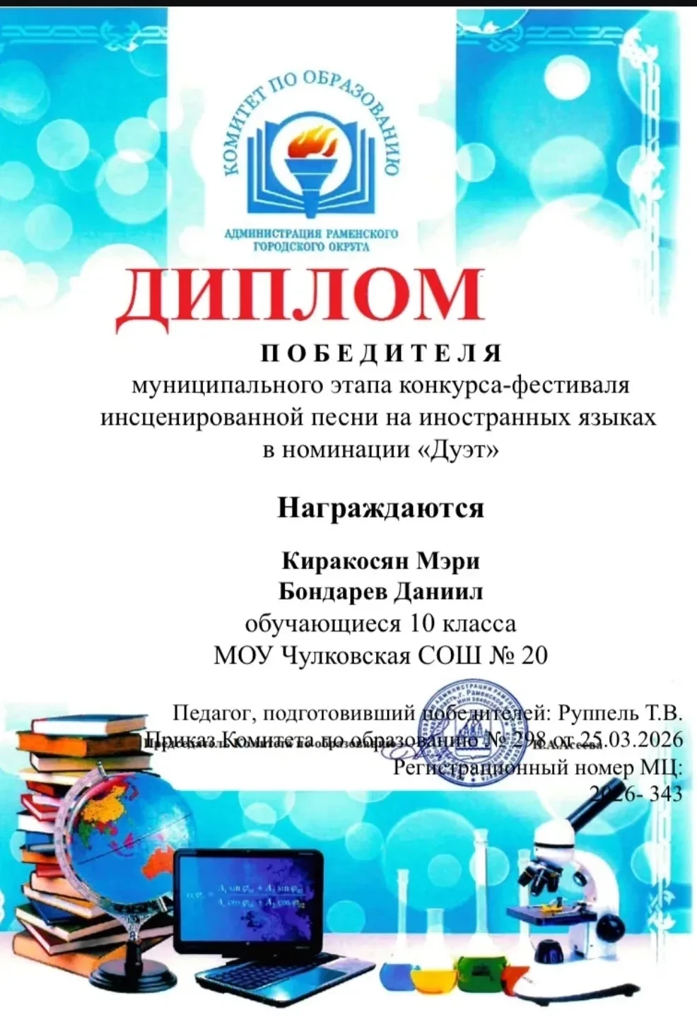 От МОУ Чулковской СОШ 20 принимали участие в конкурсе две воспитанницы - Ганчогло Екатерина (ДО 73) и Рустамова Элона (ДО 50) . Екатерина заняла 2-е место, а Элона заняла 3-е место.
