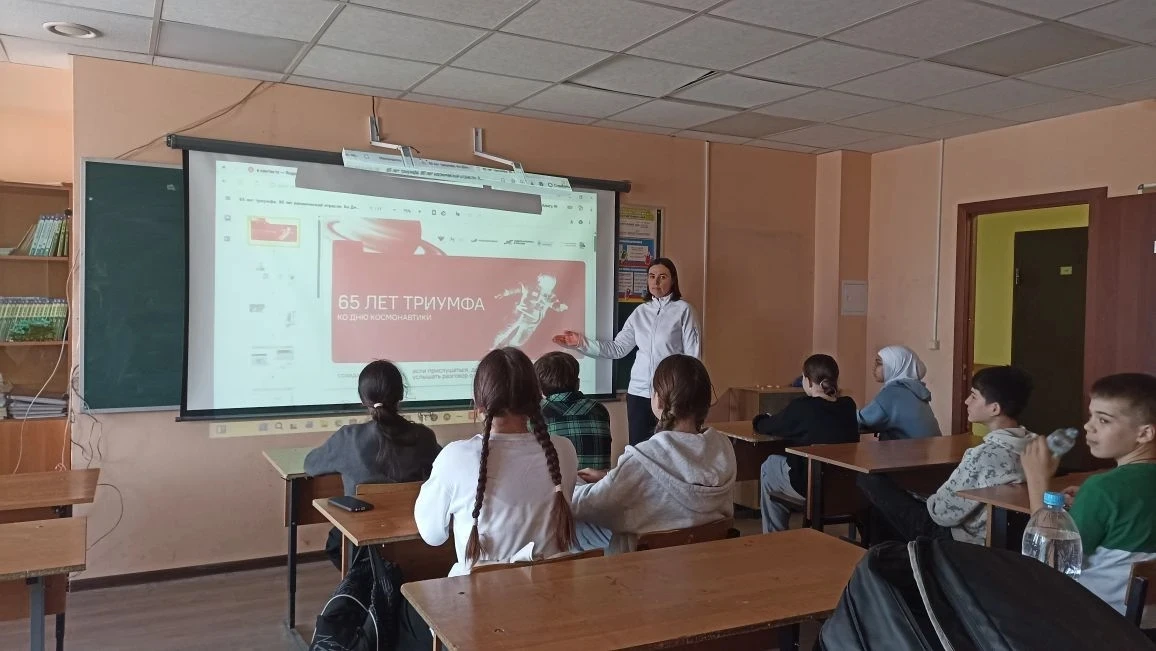 На занятии «Разговоры о важном», приуроченном ко Дню космонавтики, школьники познакомились с историей и перспективами отечественной космонавтики под темой «65 лет покорения космоса».