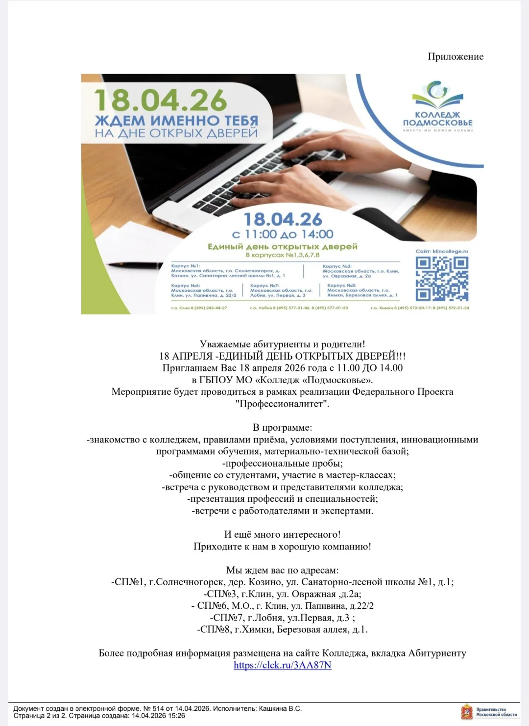 ГБПОУ МО «Колледж «Подмосковье» приглашает 18.04.2026 г. в 11.00 на мероприятие «Единый день открытых дверей» по адресу: М.О., г. Химки, Березовая аллея, д.1 в рамках Федерального проекта «Профессионалитет» с приглашением обучающихся 7,8,9,10,11 классов.