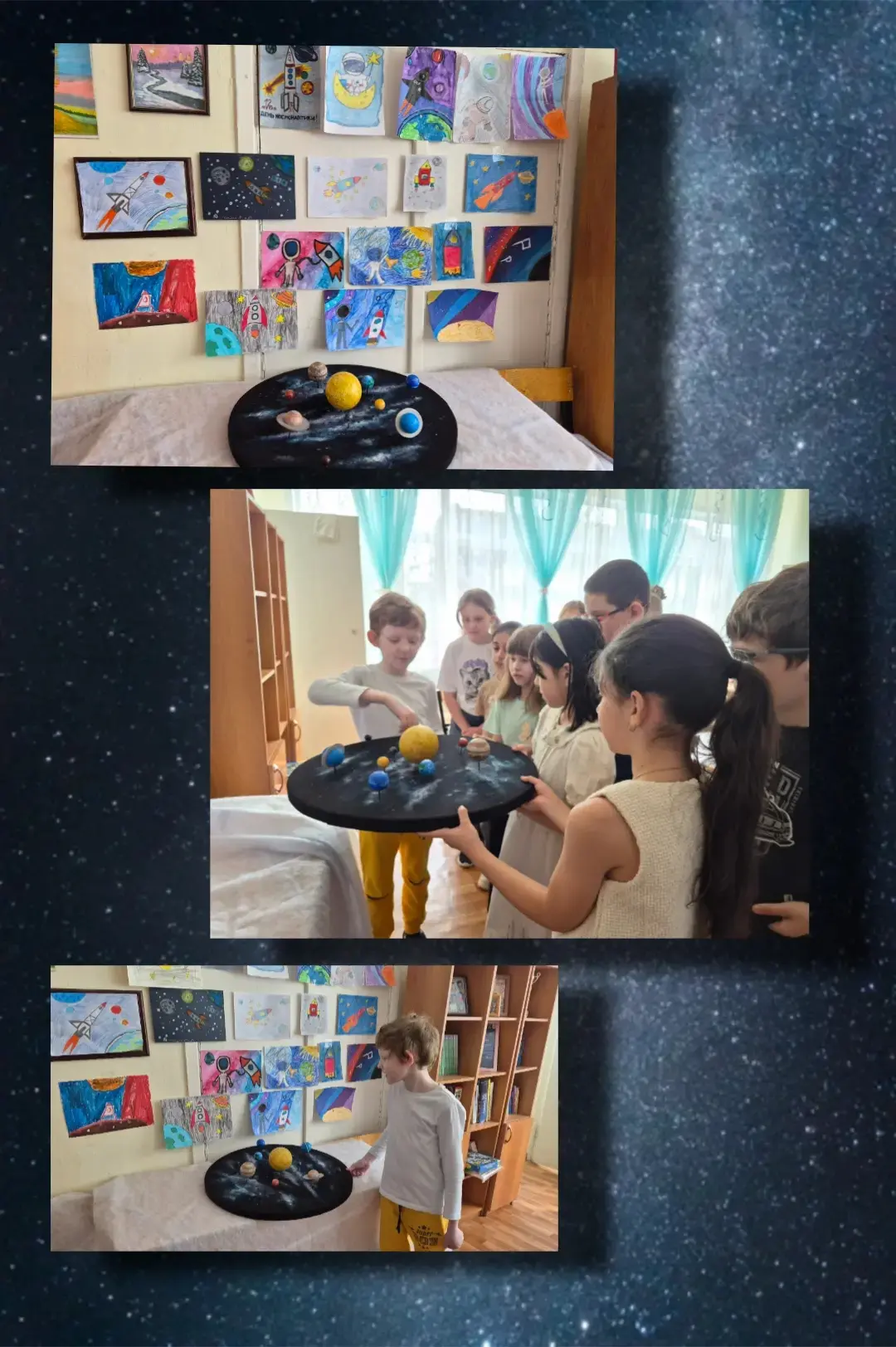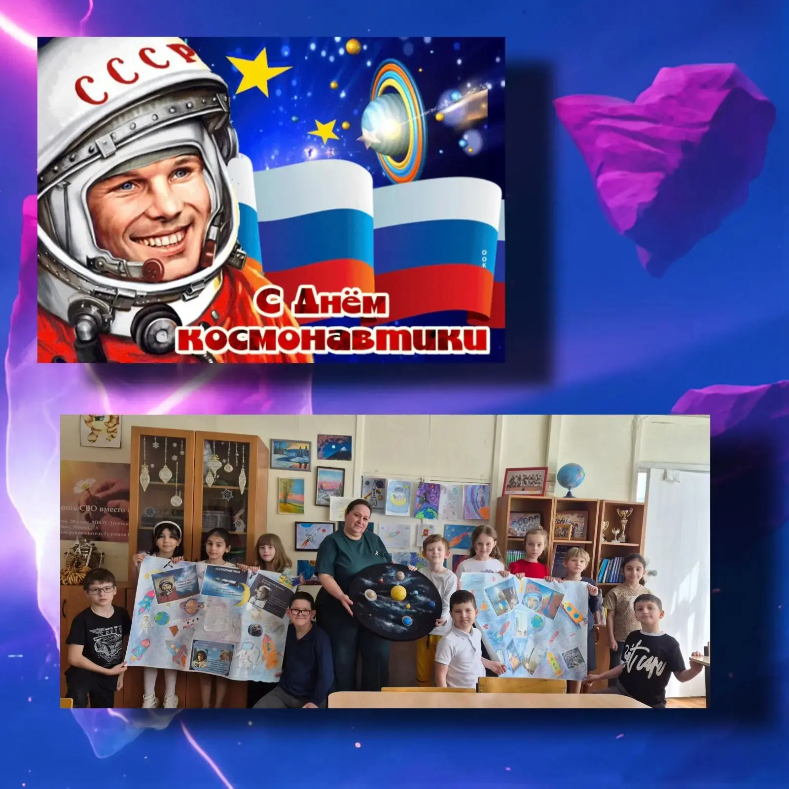 Мероприятие ко Дню космонавтики во 2 В классе, посвященное проекту «Солнечная система». Кл.руководитель Е.А.Гульбина объединила познавательную часть (история полета Юрия Гагарина 12 апреля 1961 года) и творческую проектную деятельность. Ребята вспоминают первый полет человека в космос, познакомились с биографией Юрия Алексеевича Гагарина. Учащиеся «отправляются» в полет по Солнечной системе, изучая порядок планет от Солнца (Меркурий, Венера, Земля, Марс, Юпитер, Сатурн, Уран, Нептун).Мероприятие направлено на формирование первичных представлений