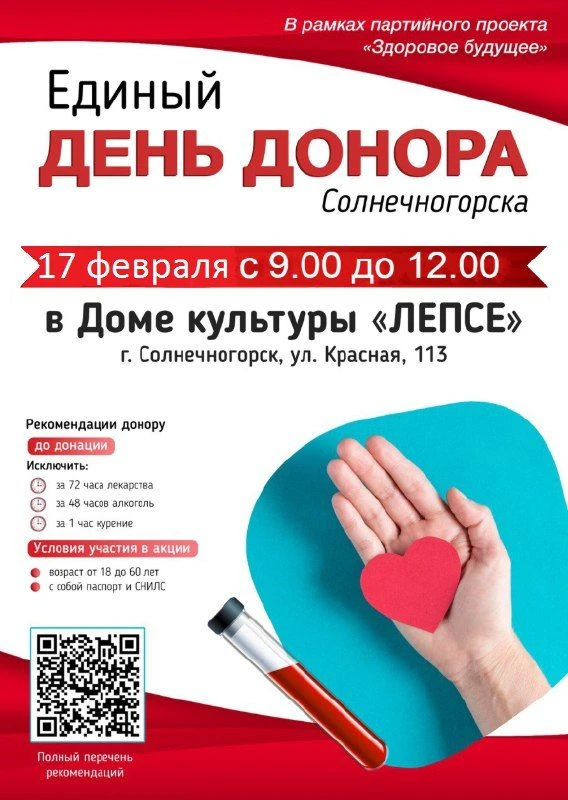 17 февраля 2026 в ДК «Лепсе» состоится выездная донорская акция.