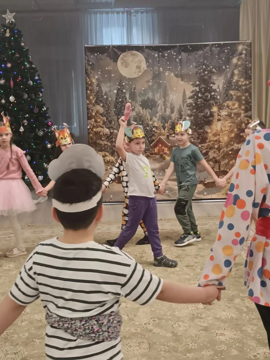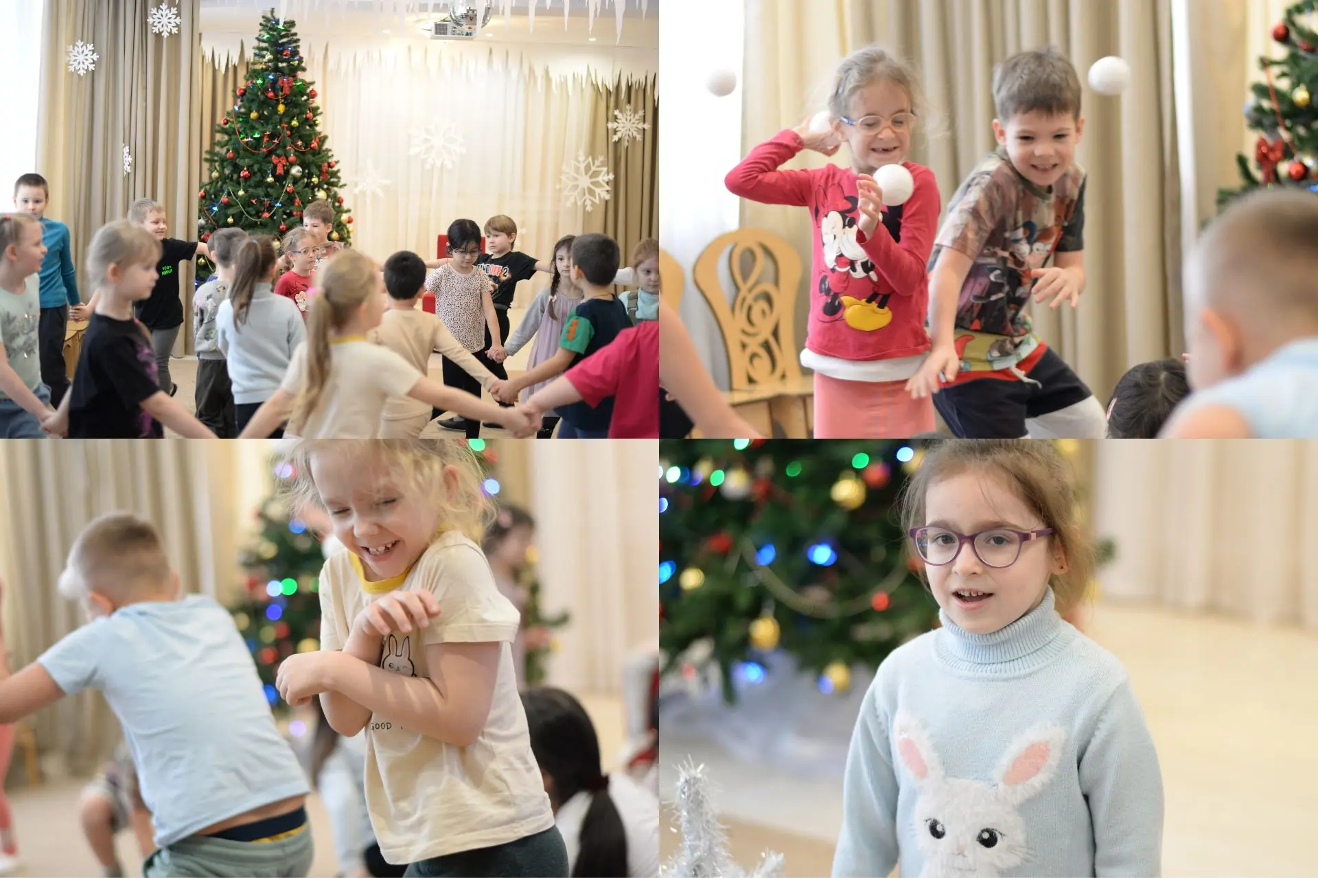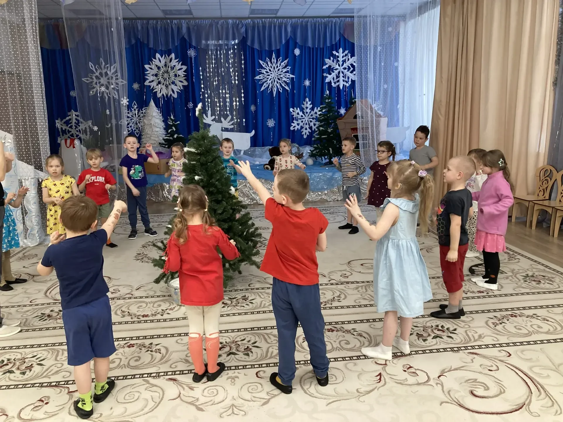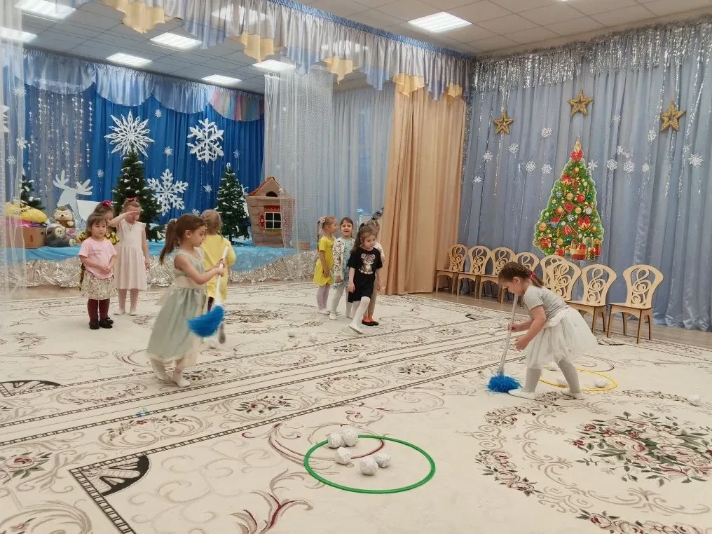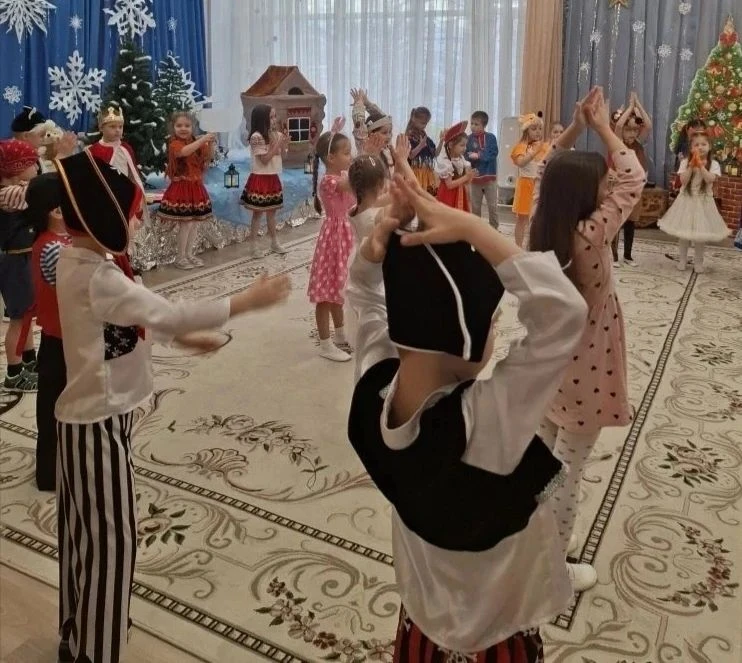 Не обошлось и без веселых игр. Дети с азартом играли в снежки, бросая их друг в друга и заливисто смеясь. Звонкий смех заполнил зал, создавая атмосферу беззаботного веселья. Кульминацией праздника стал традиционный хоровод вокруг елки. Дети, взявшись за руки, пели новогодние песни и танцевали, ощущая единство и радость общего момента.