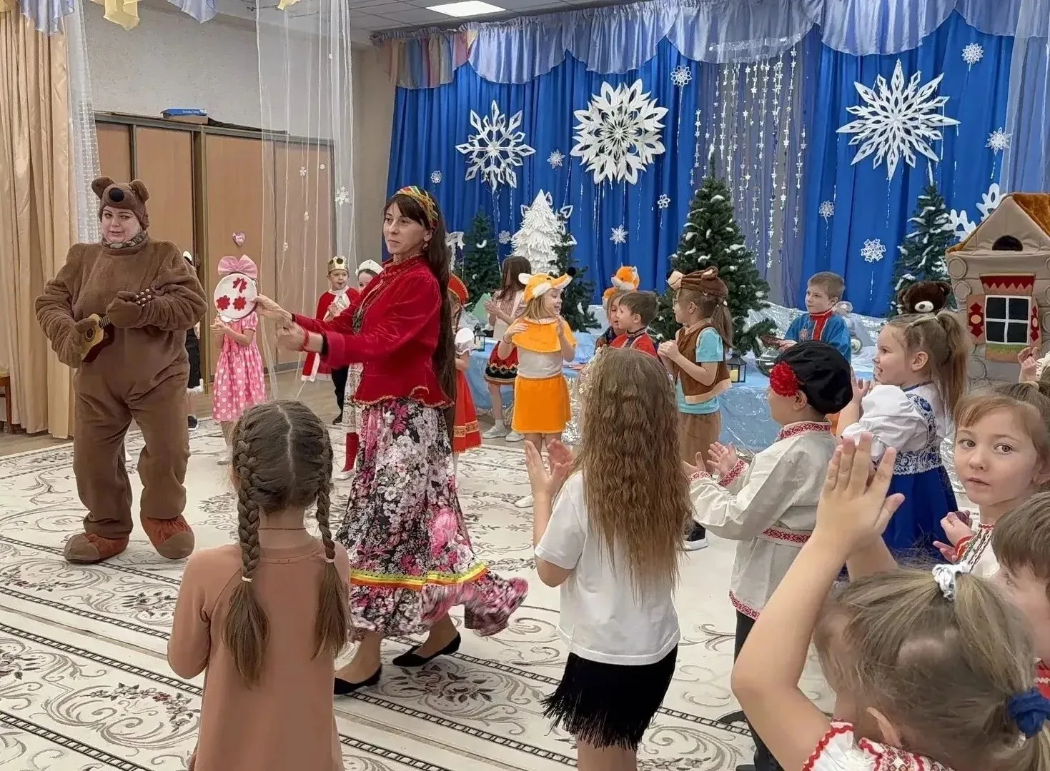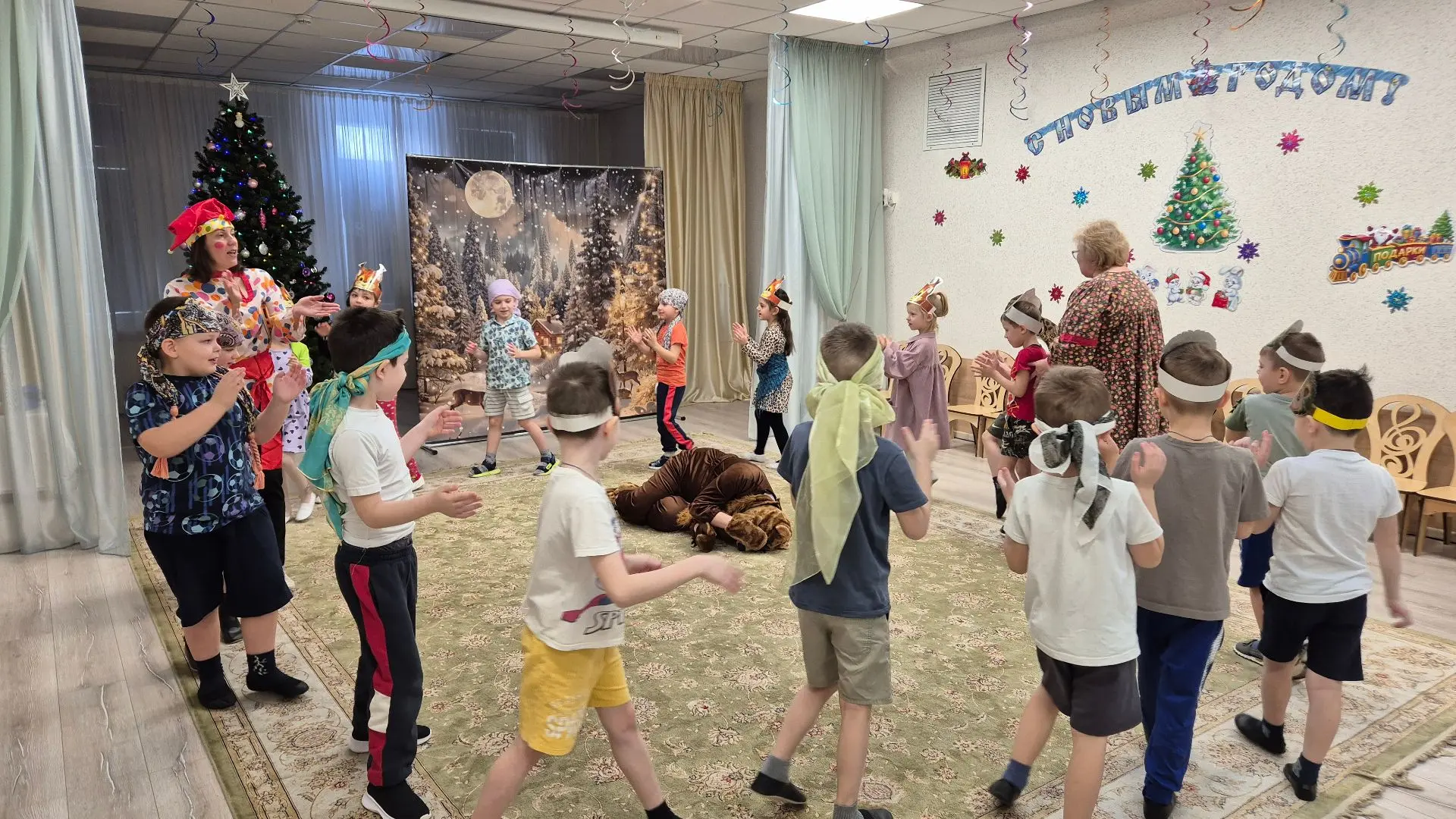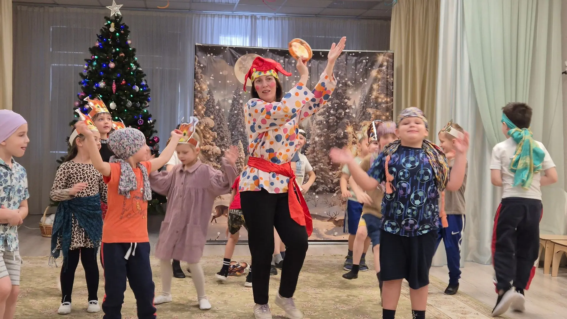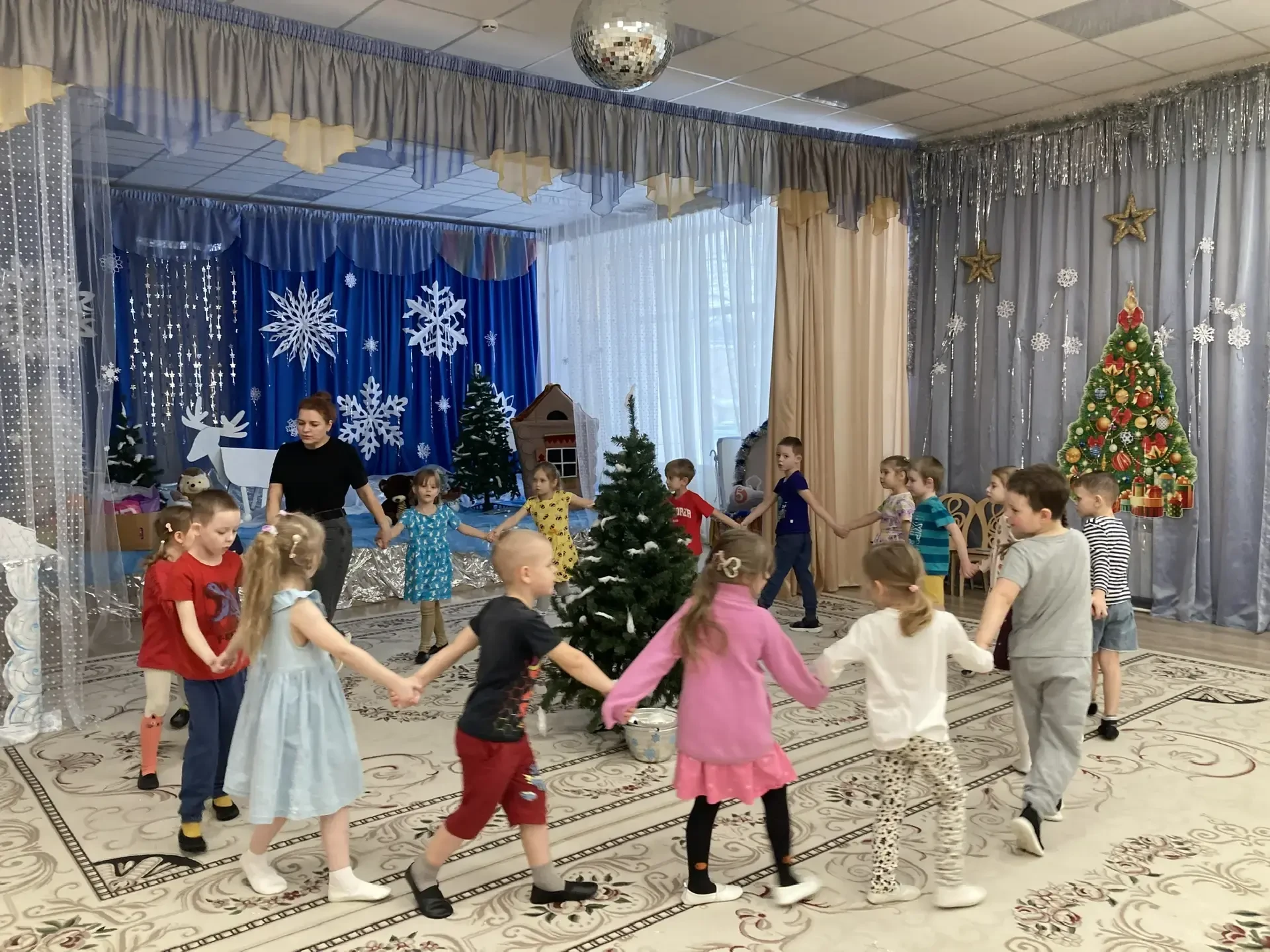 Не обошлось и без веселых игр. Дети с азартом играли в снежки, бросая их друг в друга и заливисто смеясь. Звонкий смех заполнил зал, создавая атмосферу беззаботного веселья. Кульминацией праздника стал традиционный хоровод вокруг елки. Дети, взявшись за руки, пели новогодние песни и танцевали, ощущая единство и радость общего момента.