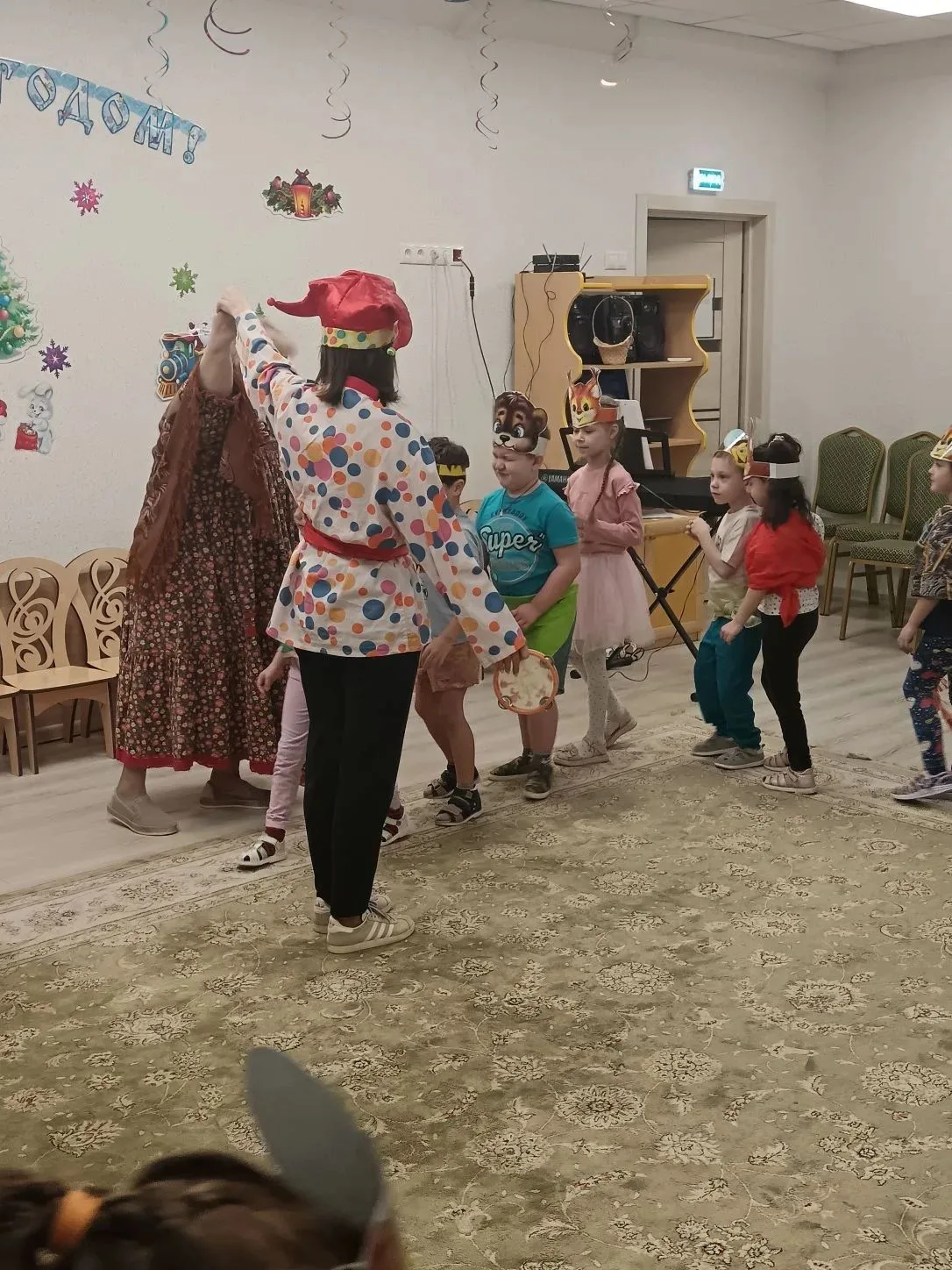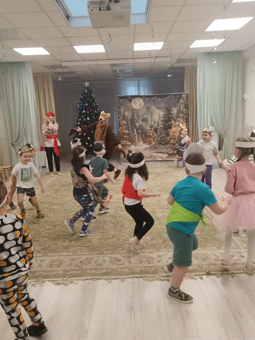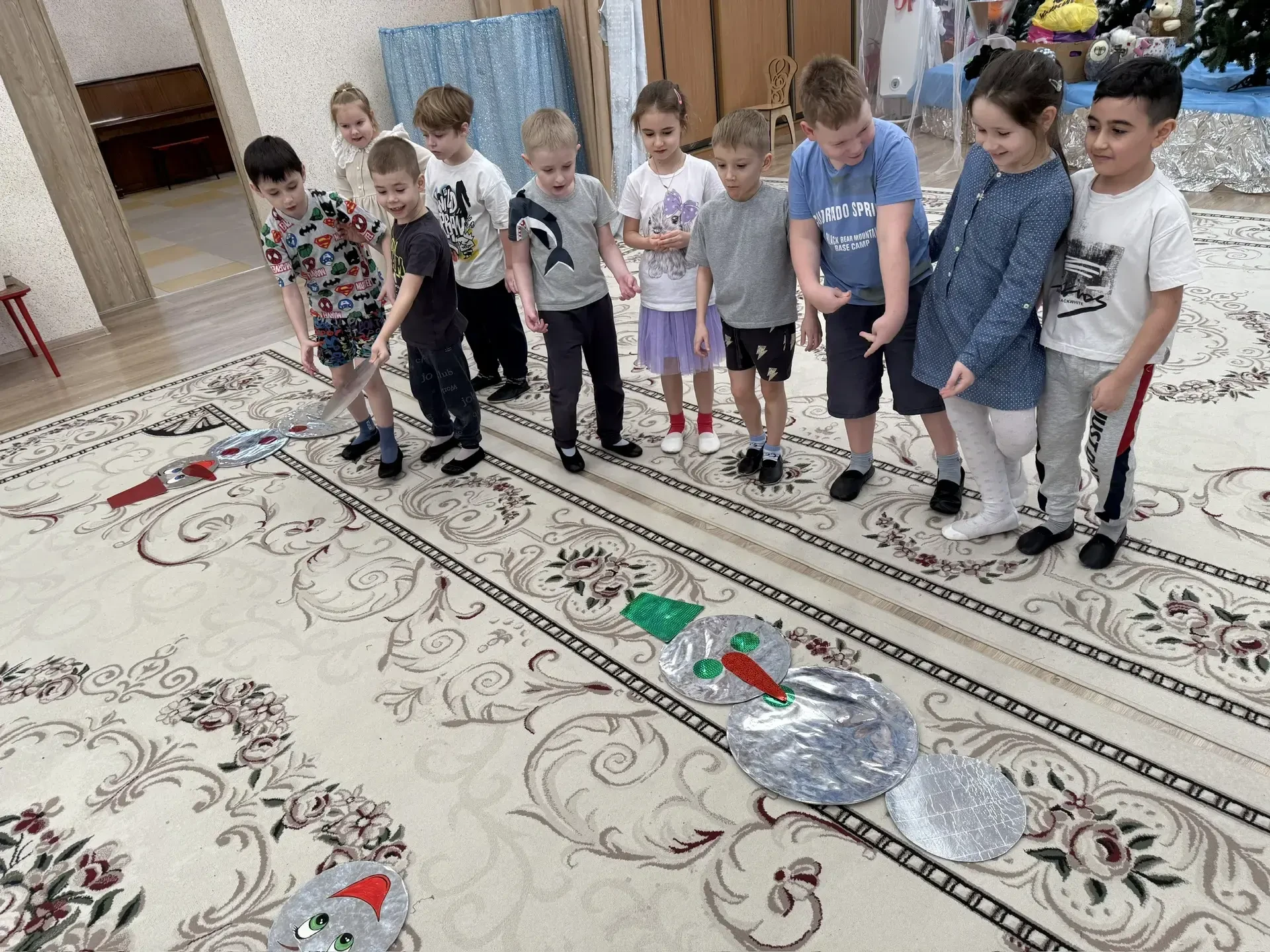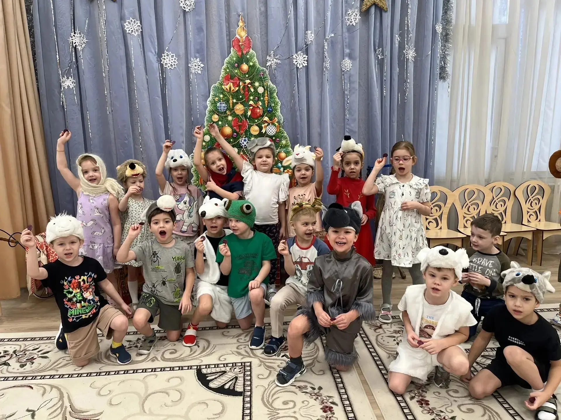 Не обошлось и без веселых игр. Дети с азартом играли в снежки, бросая их друг в друга и заливисто смеясь. Звонкий смех заполнил зал, создавая атмосферу беззаботного веселья. Кульминацией праздника стал традиционный хоровод вокруг елки. Дети, взявшись за руки, пели новогодние песни и танцевали, ощущая единство и радость общего момента.