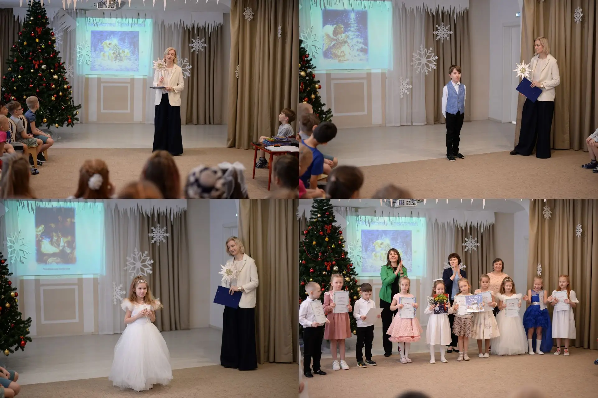 Выступления ребят были по-настоящему замечательными: каждый старался передать атмосферу праздника через интонации и эмоции, вызывая у зала улыбки и аплодисменты. В конце мероприятия состоялось вручение призовых мест и наград — такие заслуженные награды получили самые яркие и креативные исполнители. Особенно запомнилась выступление Ульяны М., которая прочитала стихотворение Ф.М. Достоевского "Крошка-ангел".