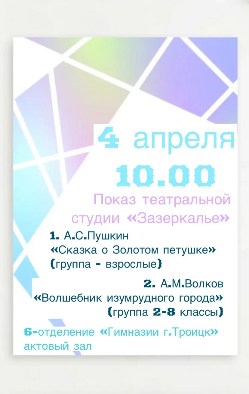 Приглашаем на показ школьной театральной студии "Зазеркалье"