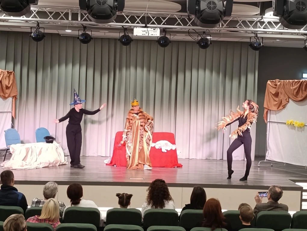 Сначала взрослой группой студии был показан спектакль «Сказка о золотом петушке» А.С.Пушкина. Несмотря на то, что занятия в этой группе идут только 6 месяцев, артисты с легкостью перевоплощались в разных персонажей, демонстрируя виртуозное владение текстом Пушкина.