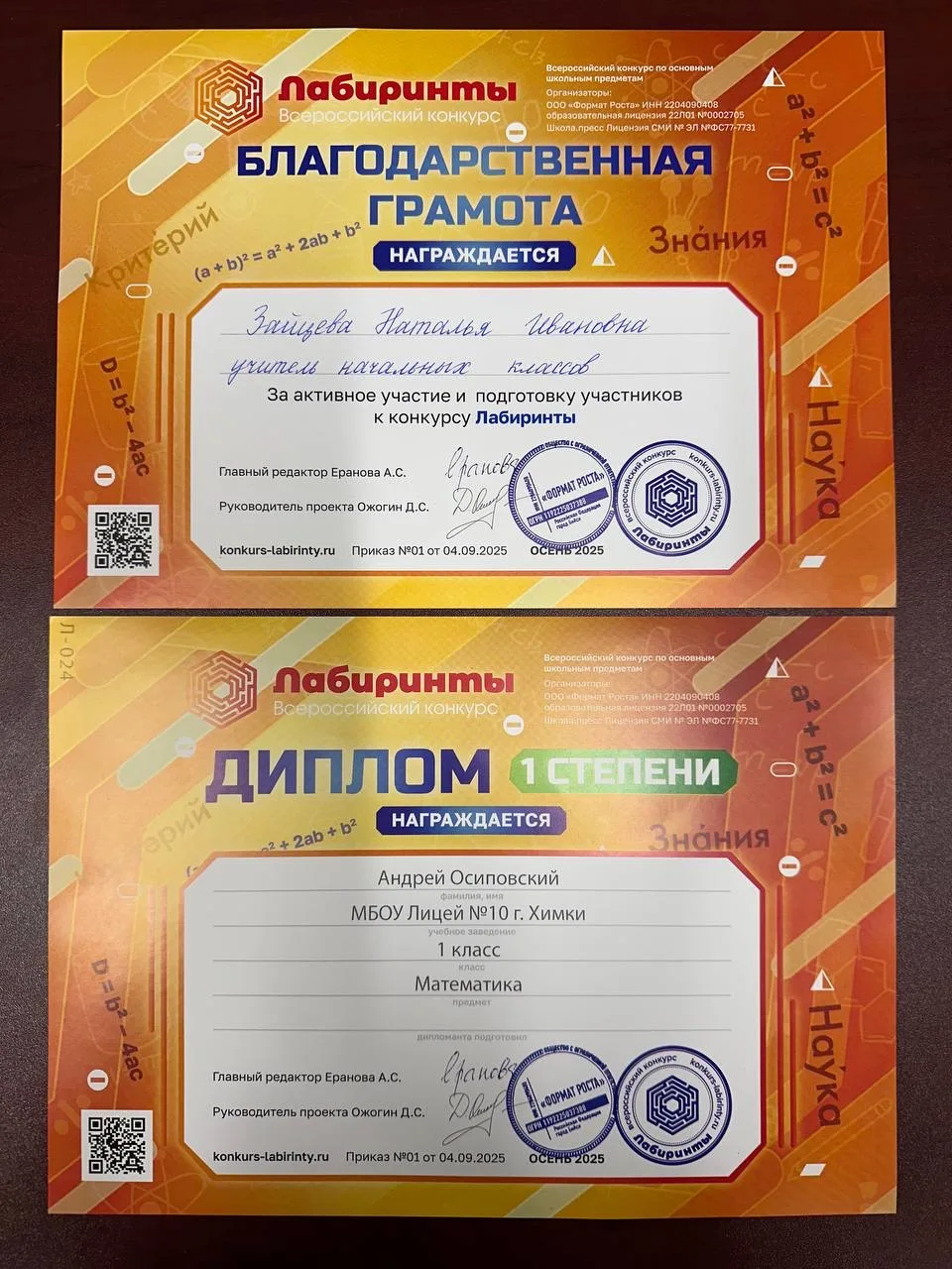 Поздравляем нашего ученика Андрея Осиповского(1 класс) с победой в Всероссийском конкурсе «Лабиринты»! 🎉