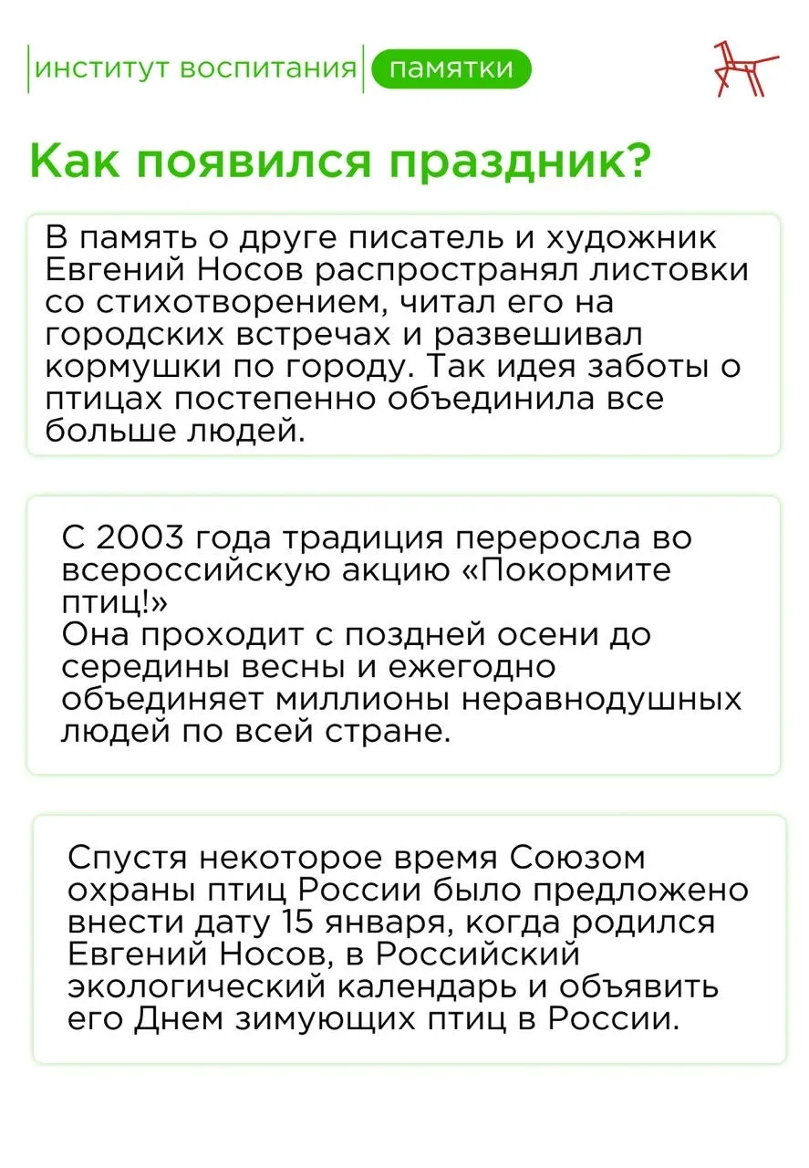❄️ Эта традиция переросла в общегородскую, а затем и во Всероссийскую акцию. Так родился важный экологический праздник — День зимующих птиц России.