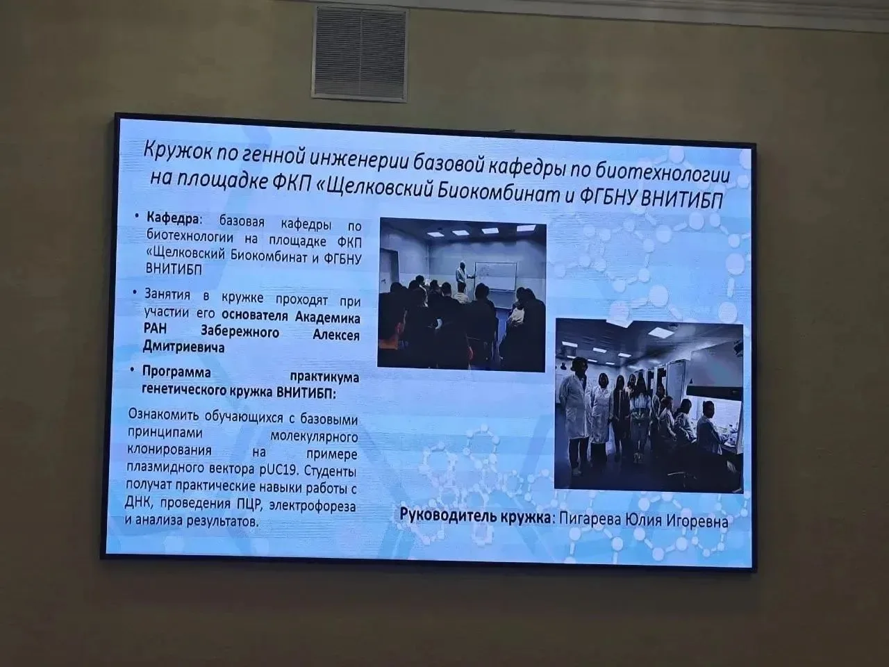 ФГБНУ ВНИТИБП представлял руководитель кружка по генной инженерии базовой кафедры по биотехнологии на площадке ФКП «Щелковский Биокомбинат» и ФГБНУ ВНИТИБП Пигарева Юлия Игоревна.