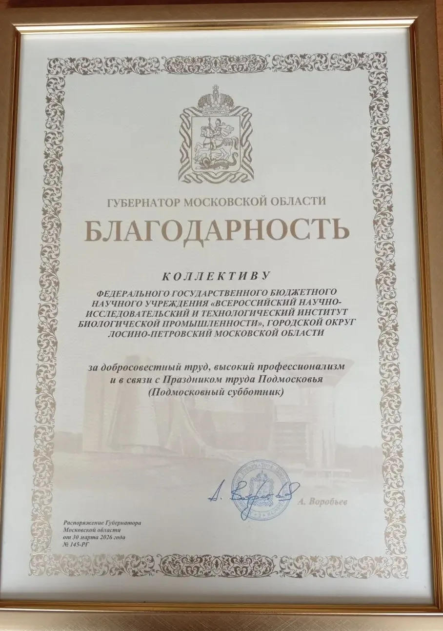 Так же был награжден коллектив ВНИТИБП в лице директора Подоплекина Данила Николаевича за добросовестный труд,высокий профессионализм и в связи с праздником труда Подмосковья.